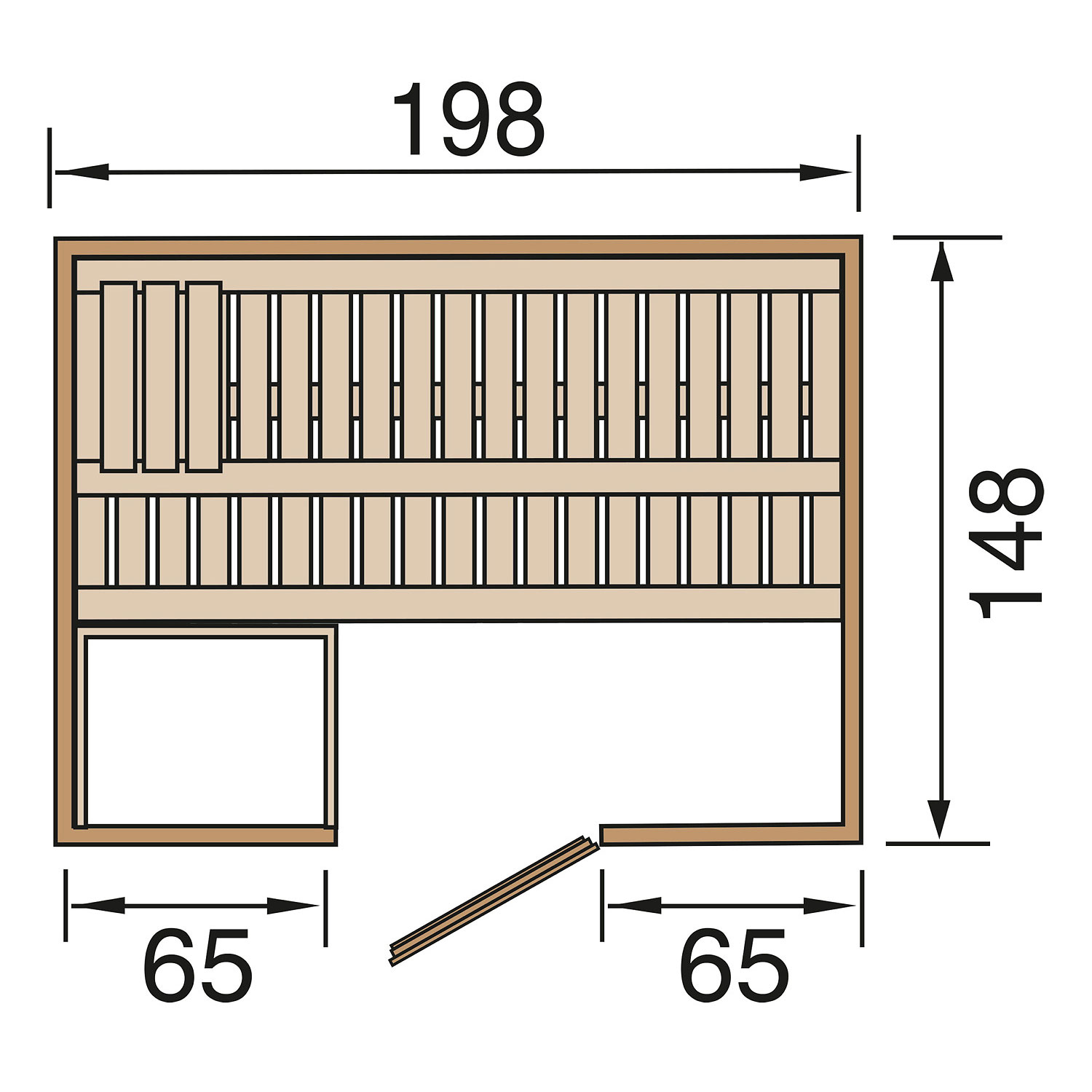 Die Sauna verfügt über ein Außenmaß von 195,5 cm x 145 cm. Die Grundfläche der Sauna beträgt 2,59 m².