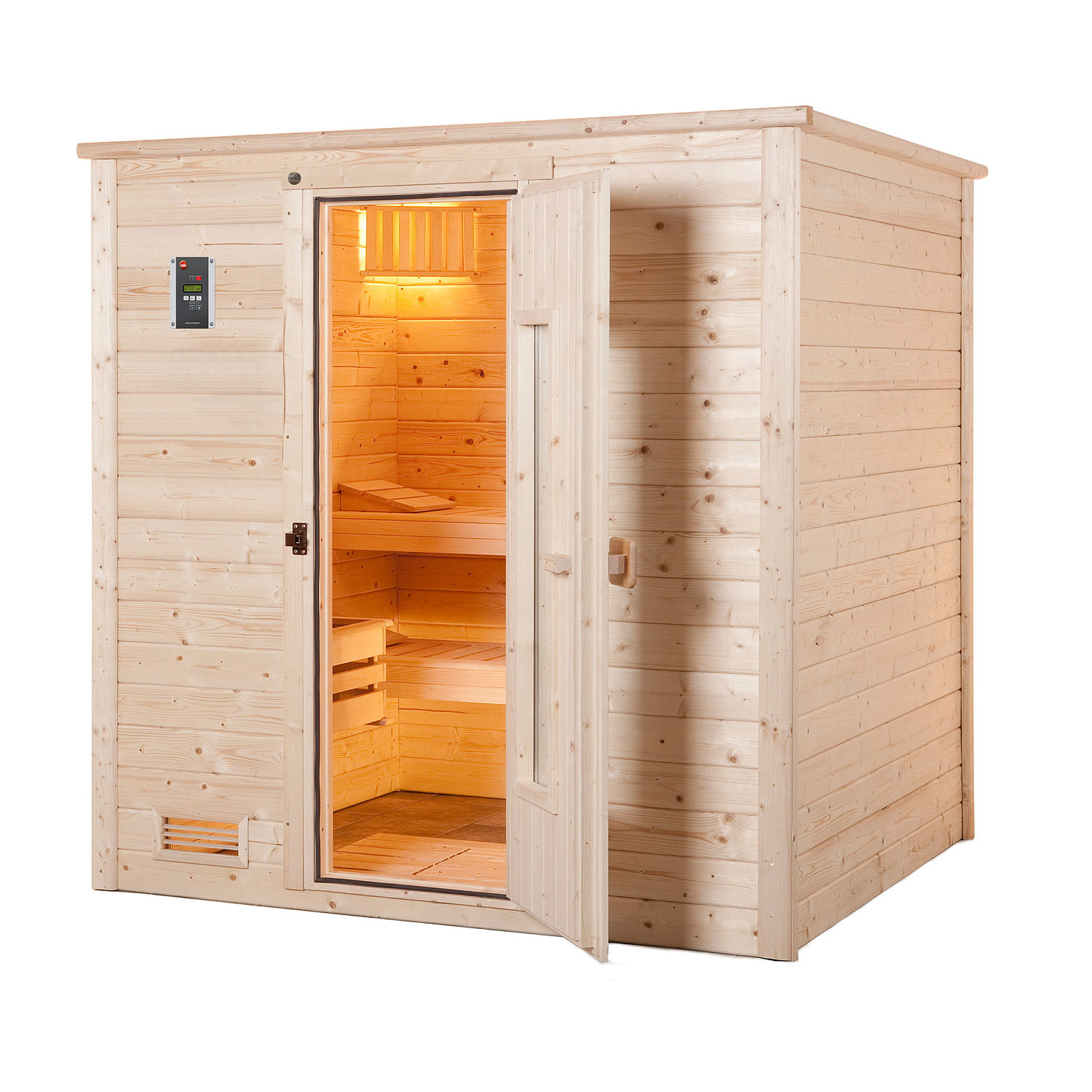 Die Sauna verfügt über ein Außenmaß von 195,5 cm x 178 cm. Die Grundfläche der Sauna beträgt 3,21 m².