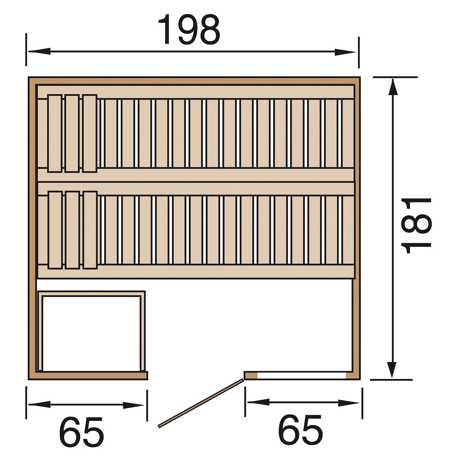 Die Sauna verfügt über ein Außenmaß von 195,5 cm x 178 cm. Die Grundfläche der Sauna beträgt 3,21 m².