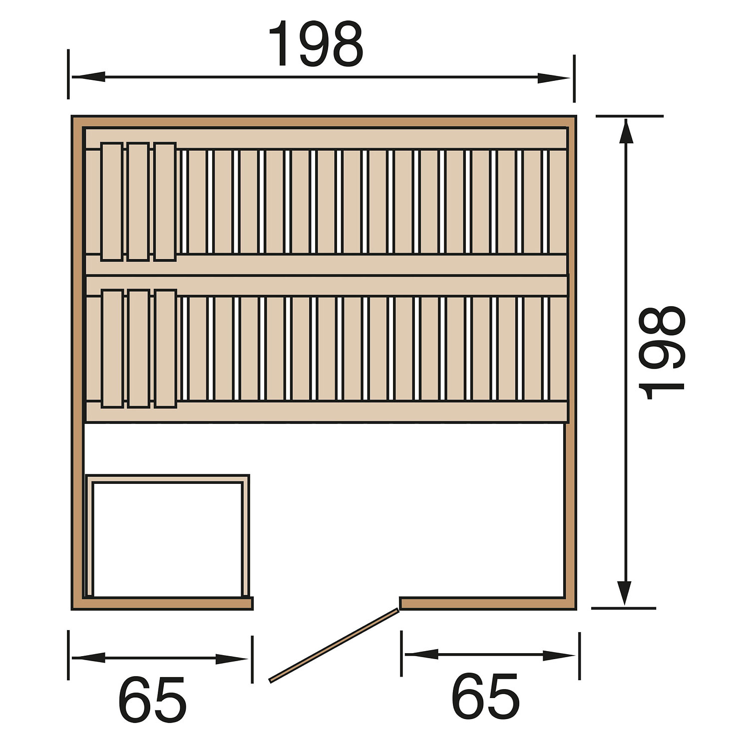 Die Sauna verfügt über ein Außenmaß von 195,5 cm x 195 cm. Die Grundfläche der Sauna beträgt 3,53 m².