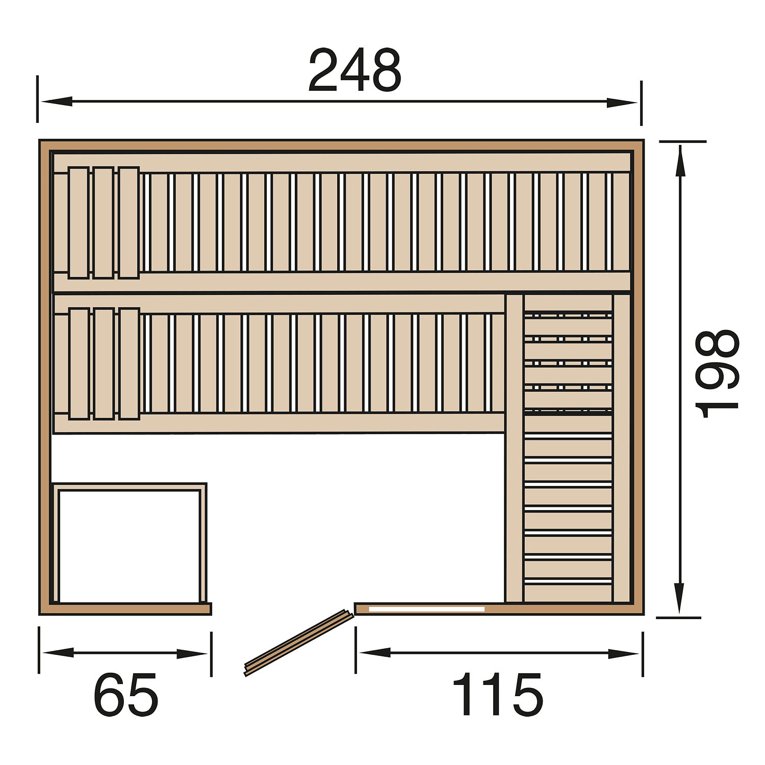 Die Sauna verfügt über ein Außenmaß von 245,5 cm x 195 cm. Die Grundfläche der Sauna beträgt 4,47 m².