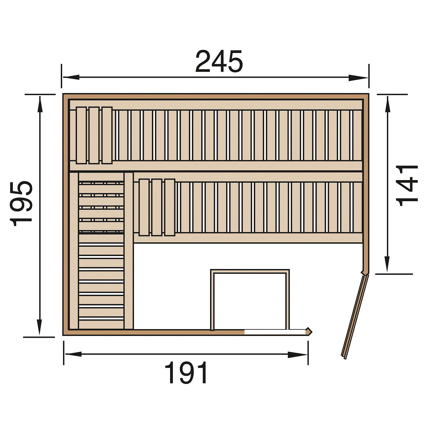 Die Sauna verfügt über ein Außenmaß von 248 cm x 198 cm. Die Grundfläche der Sauna beträgt 4,47 m².