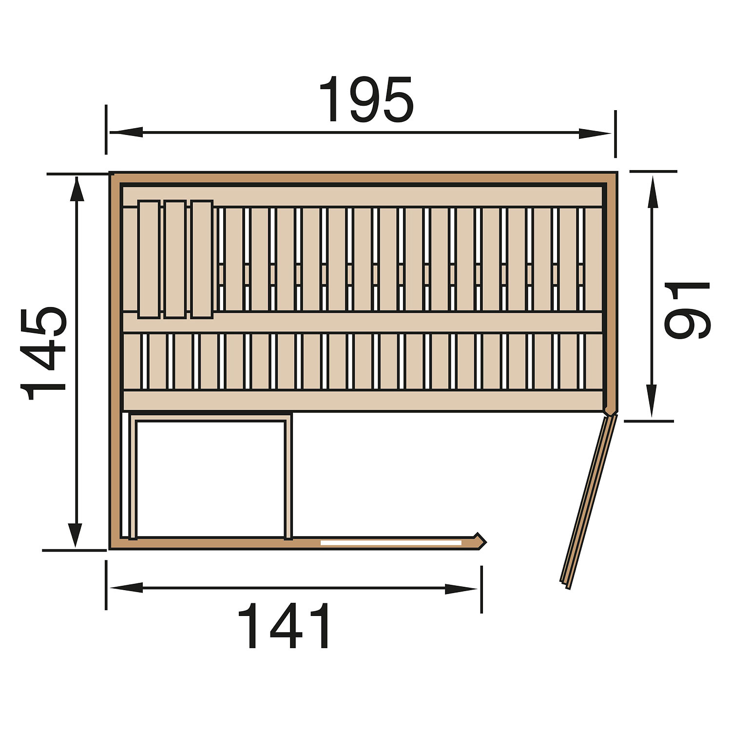Die Sauna verfügt über ein Außenmaß von 198 cm x 148 cm. Die Grundfläche der Sauna beträgt 2,59 m².