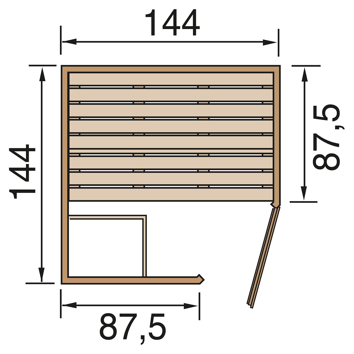 Die Sauna verfügt über ein Außenmaß von 144 cm x 144 cm. Die Grundfläche der Sauna beträgt 1,92 m².