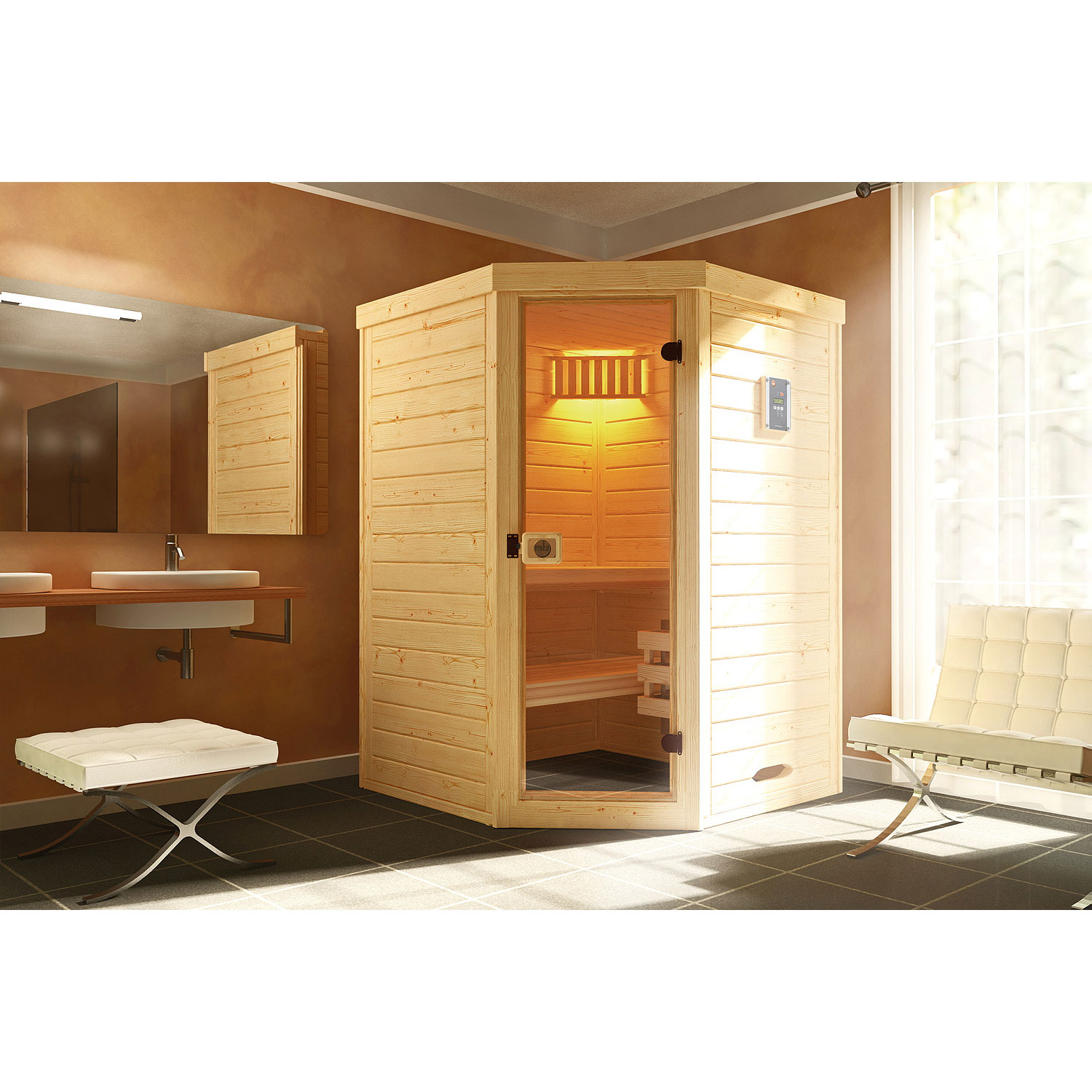 Die Tür besteht komplett aus klarem Sicherheitsglas und lässt den Innenraum damit lichtdurchflutet erscheinen. Für eine angenehme Beleuchtung sorgt das Saunaleuchten-Set.