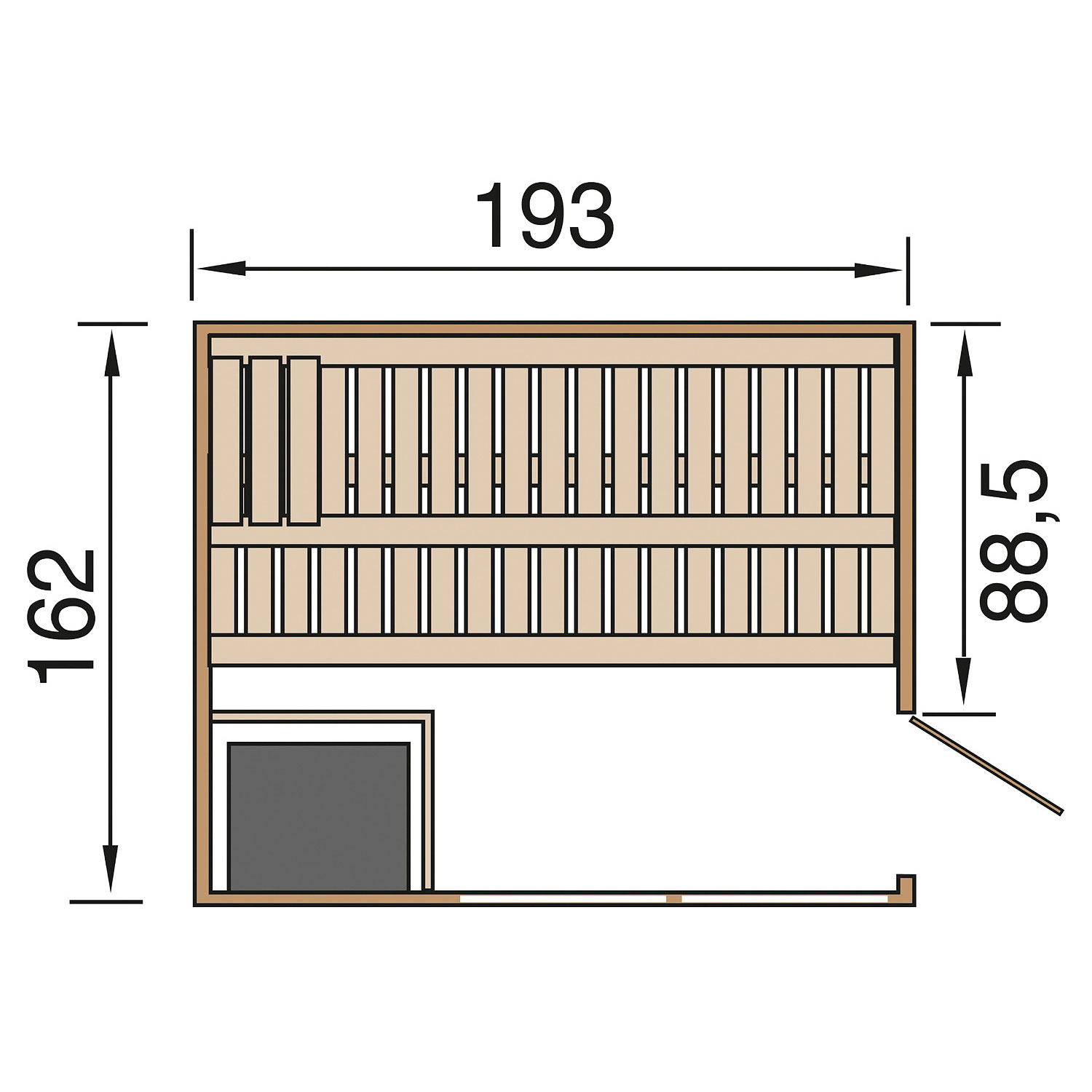 Die Sauna verfügt über ein Außenmaß von 162 cm x 193 cm. Die Grundfläche der Sauna beträgt 2,92 m².
