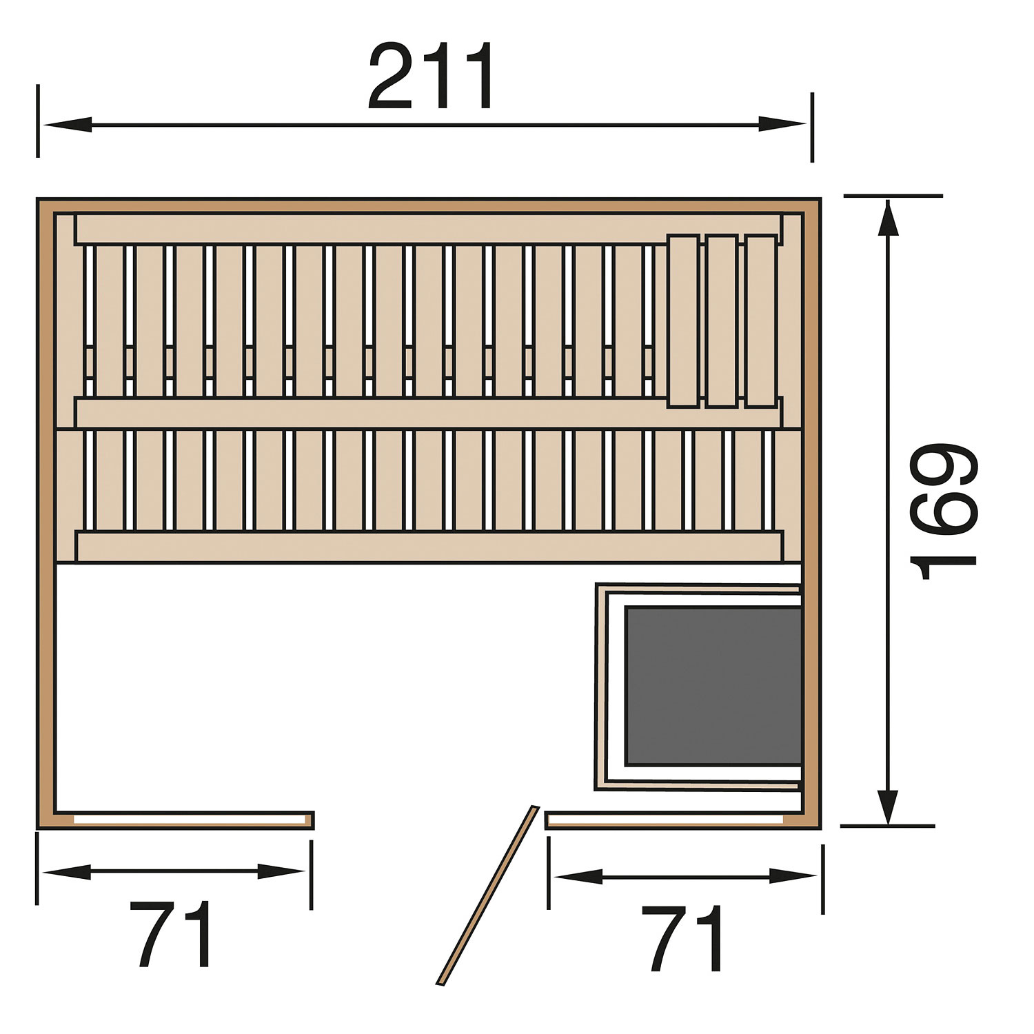 Die Sauna verfügt über ein Außenmaß von 211 cm x 169 cm. Die Grundfläche der Sauna beträgt 3,34 m².