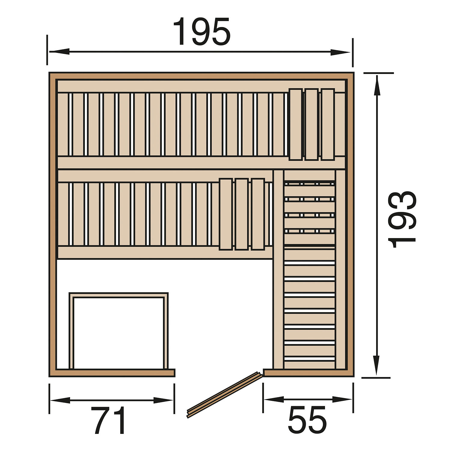 Die Sauna verfügt über ein Außenmaß von 195 cm x 193 cm. Die Grundfläche der Sauna beträgt 3,53 m².