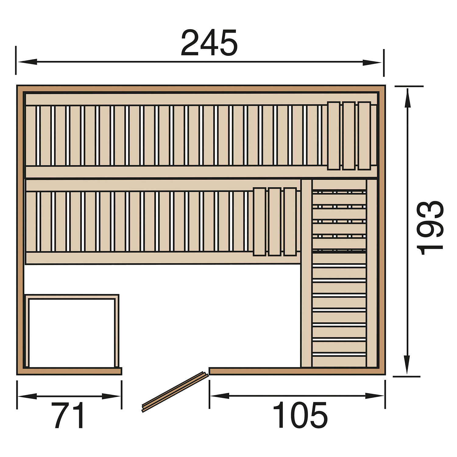 Die Sauna verfügt über ein Außenmaß von 245 cm x 193 cm. Die Grundfläche der Sauna beträgt 4,47 m².