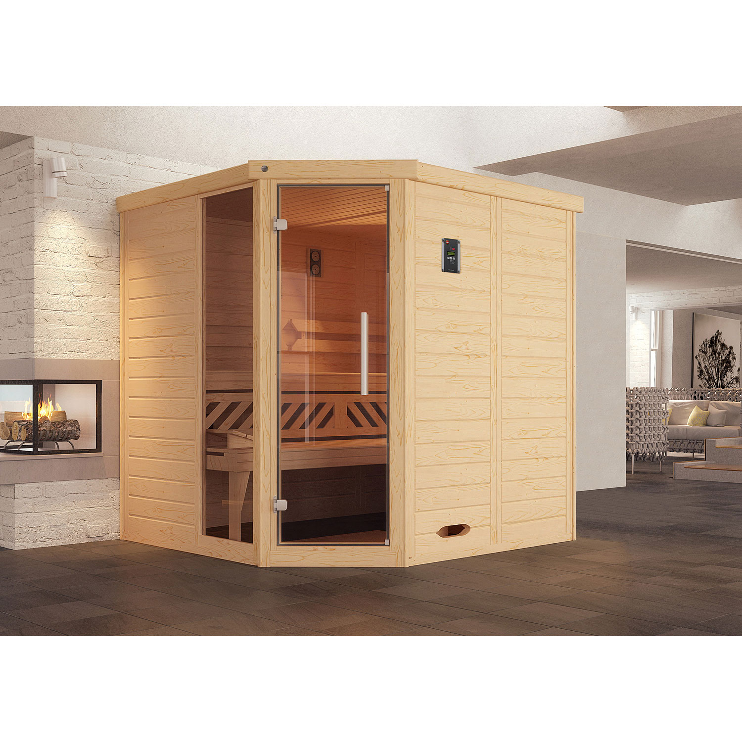 Die schöne Weka Massivholzsauna Kemi Eck 1 GTF wurde aus europäischer Fichte und mit 45 mm starken Wandbrettern gefertigt. Die Elementbauweise sorgt für einen einfachen Aufbau und eine sehr stabile Konstruktion.