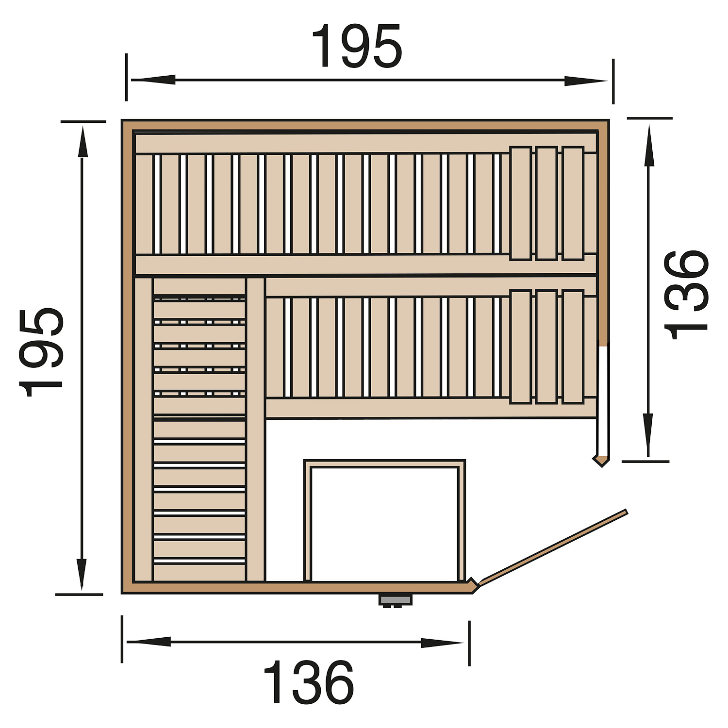 Die Sauna verfügt über ein Außenmaß von 195 cm x 195 cm. Die Grundfläche der Sauna beträgt 3,53 m².