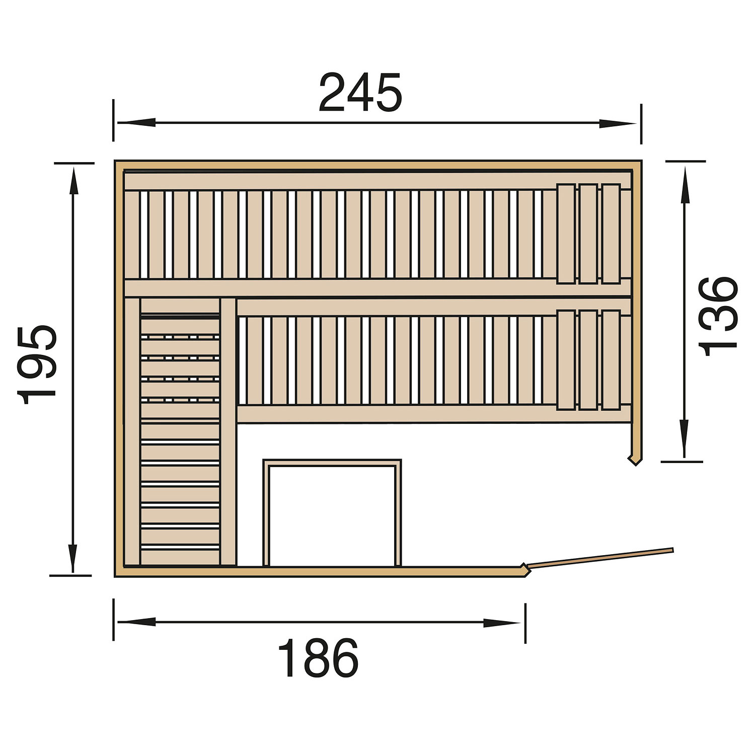 Die Sauna verfügt über ein Außenmaß von 245 cm x 195 cm. Die Grundfläche der Sauna beträgt 4,47 m².