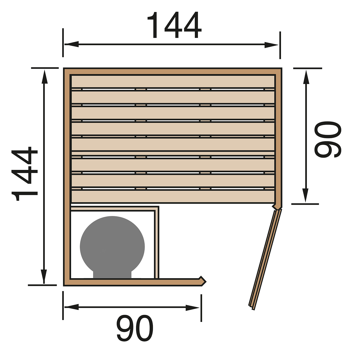 Die Sauna verfügt über ein Außenmaß von 144 cm x 144 cm. Die Grundfläche der Sauna beträgt 2,02 m².