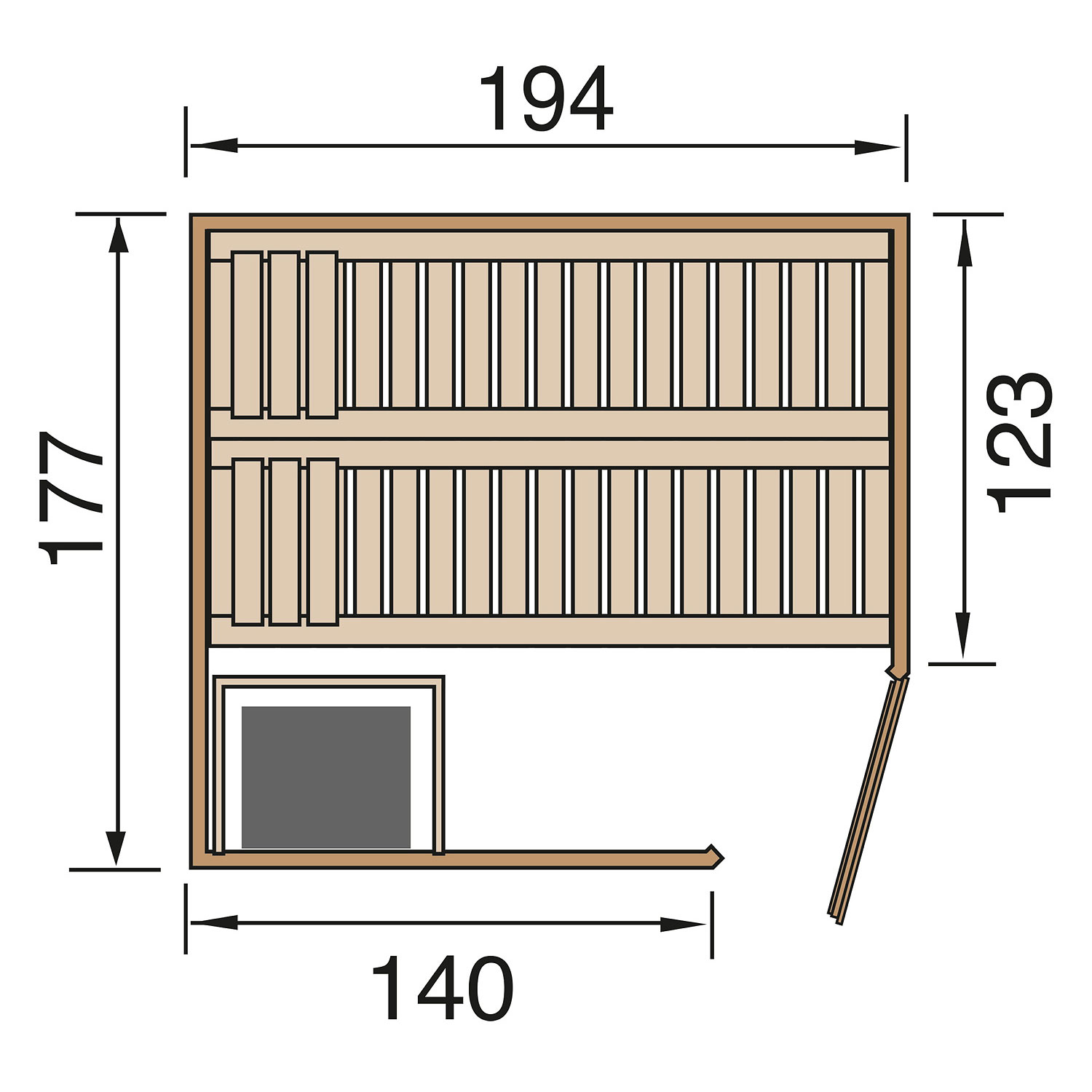 Die Sauna verfügt über ein Außenmaß von 194 cm x 177 cm. Die Grundfläche der Sauna beträgt 3,36 m².