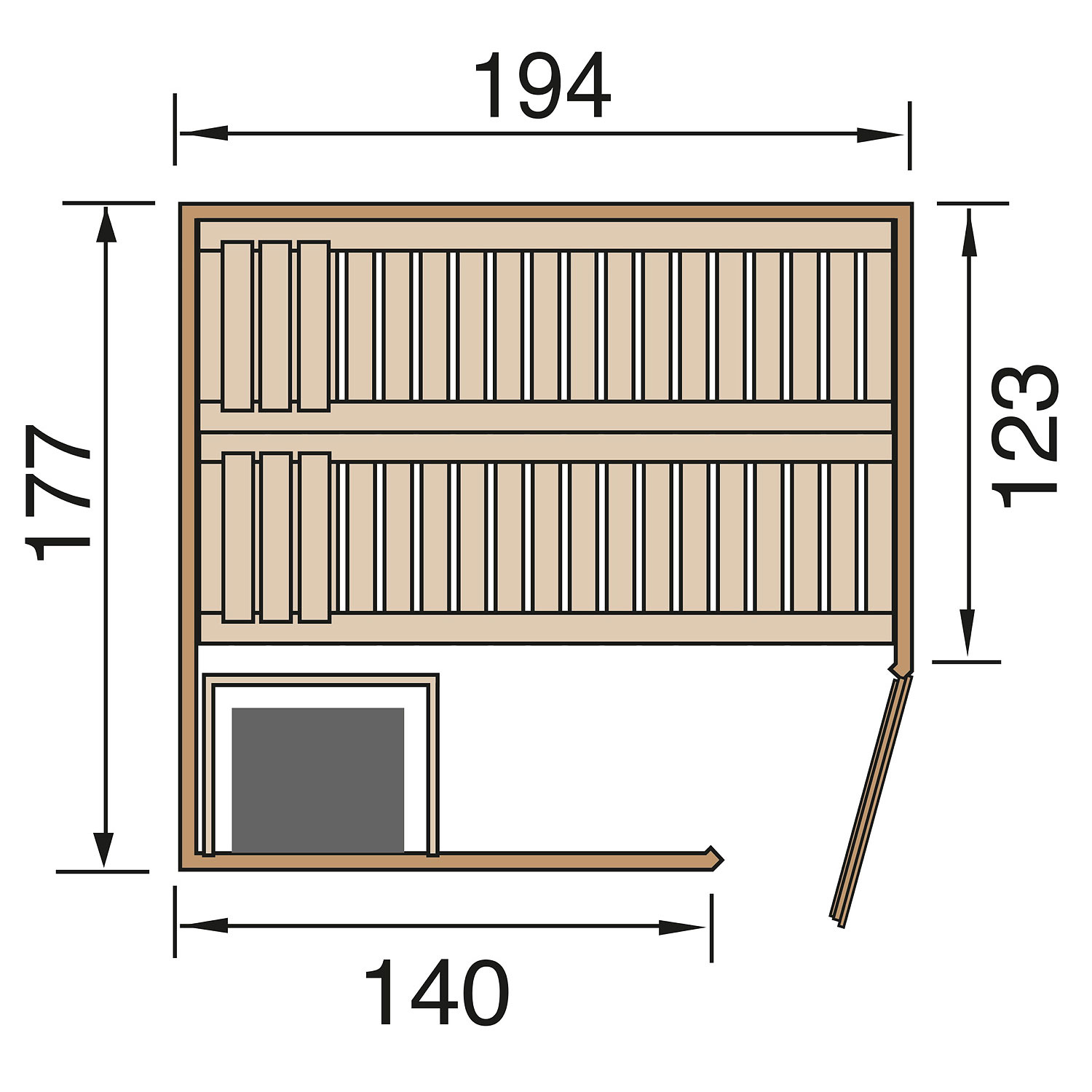 Die Sauna verfügt über ein Außenmaß von 194 cm x 177 cm. Die Grundfläche der Sauna beträgt 3,36 m².
