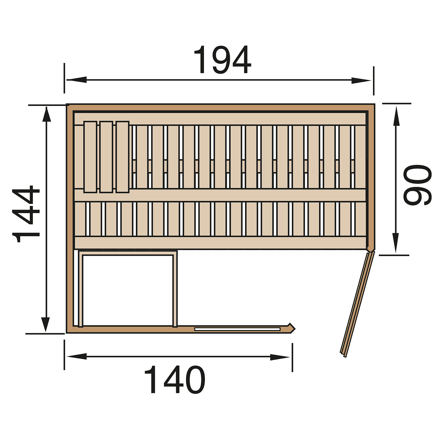 Die Sauna verfügt über ein Außenmaß von 194 cm x 144 cm. Die Grundfläche der Sauna beträgt 2,73 m².