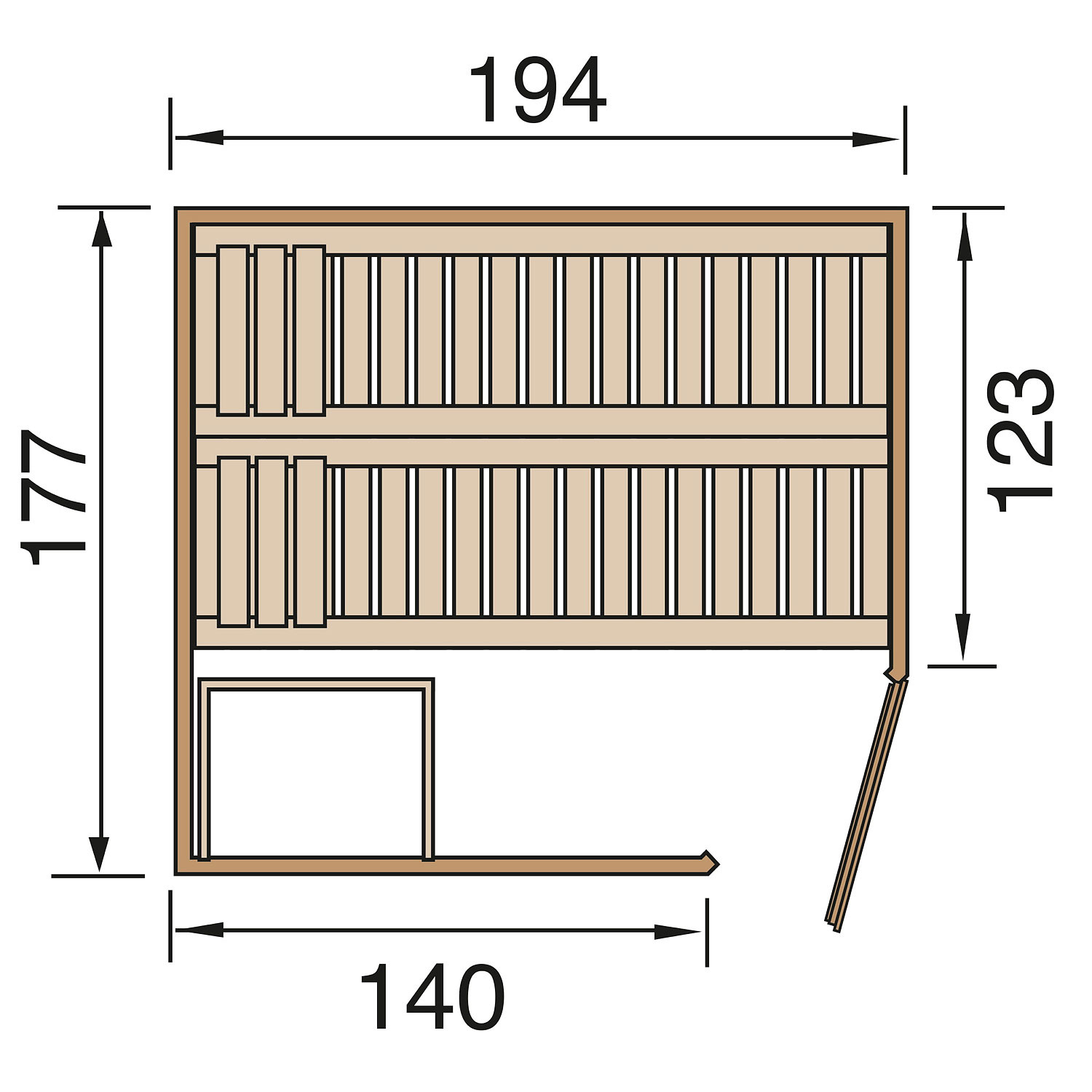 Die Sauna verfügt über ein Außenmaß von 194 cm x 177 cm. Die Grundfläche der Sauna beträgt 3,36 m².