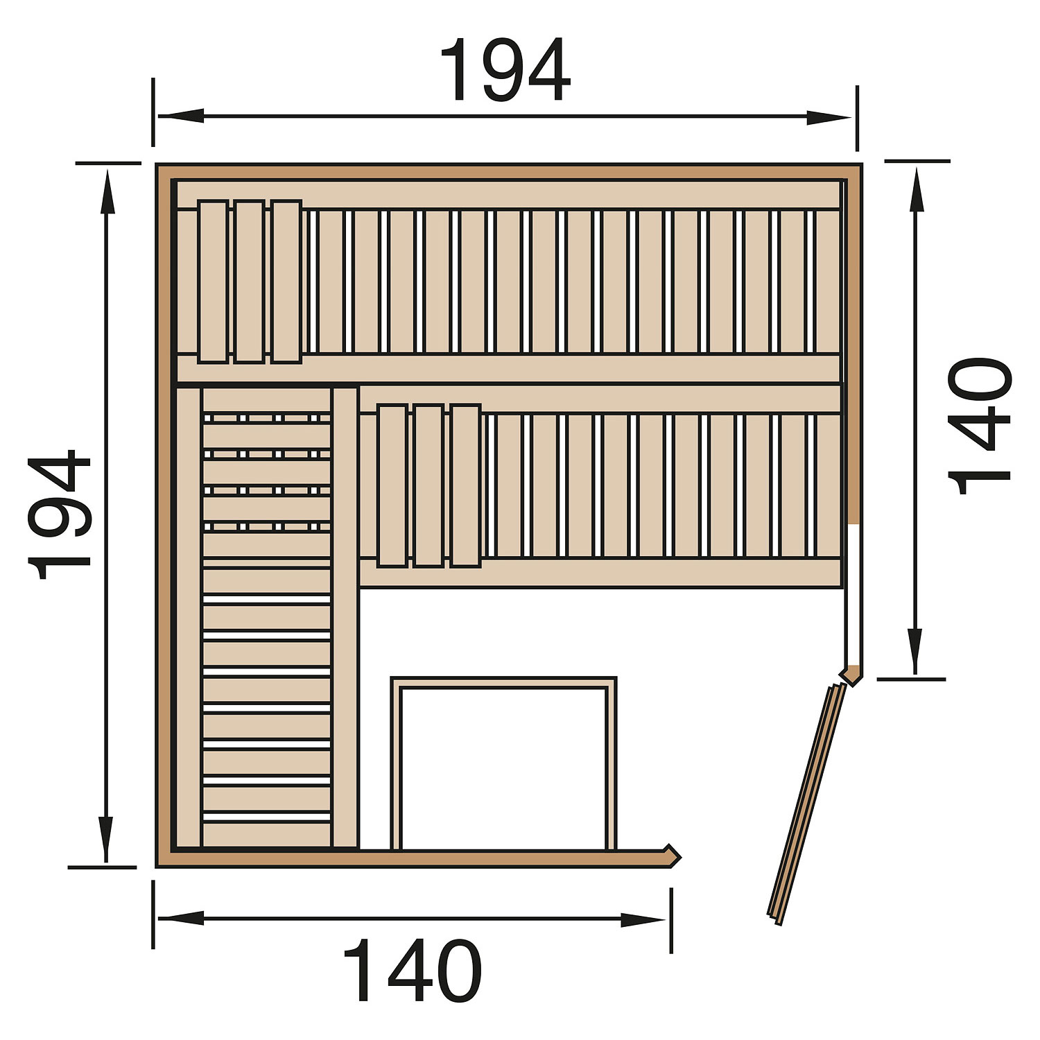 Die Sauna verfügt über ein Außenmaß von 194 cm x 194 cm. Die Grundfläche der Sauna beträgt 3,69 m².