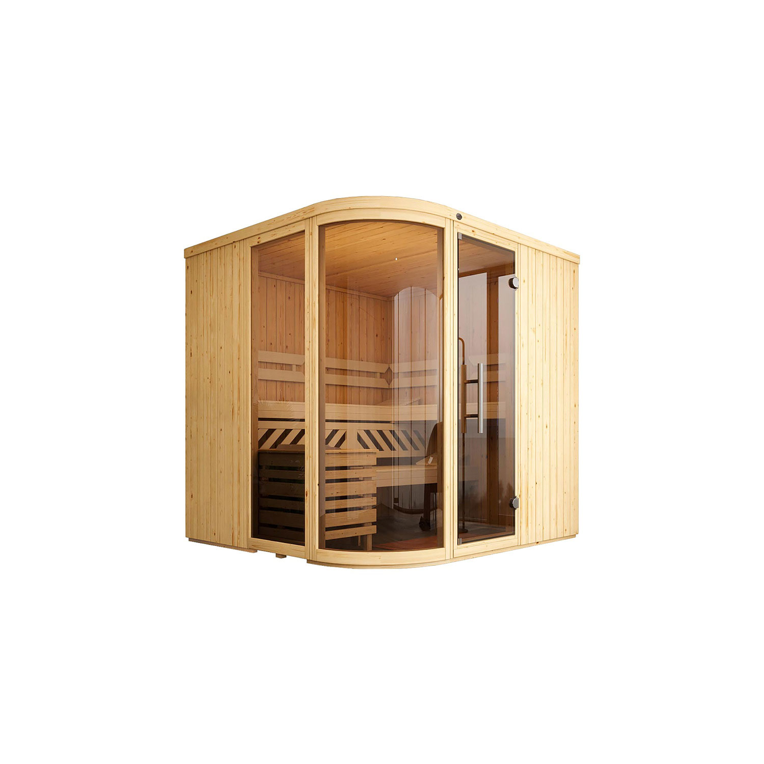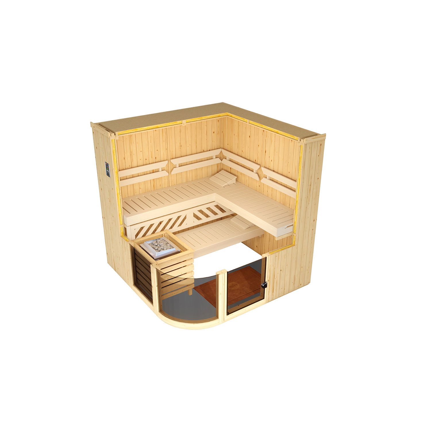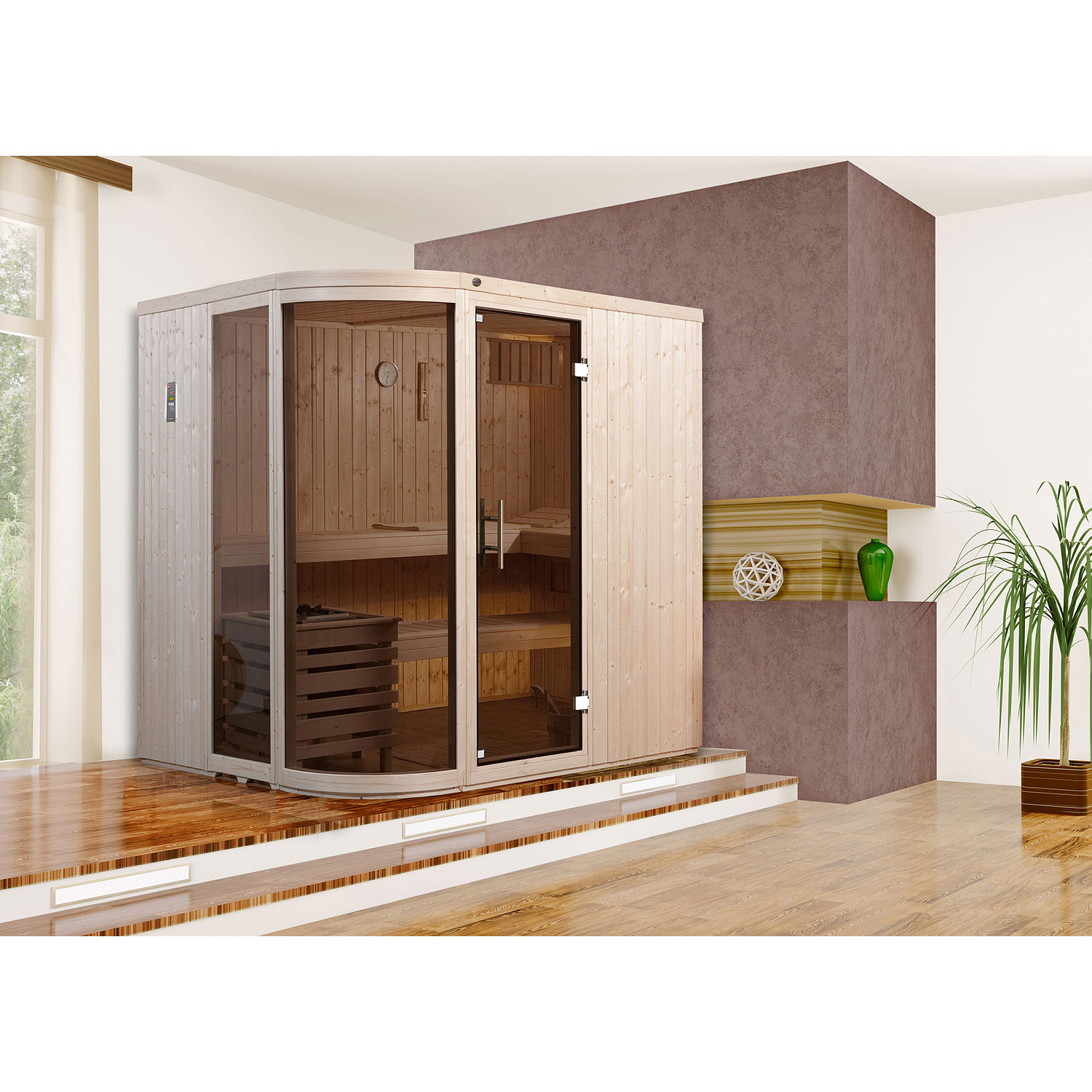 moderne Ganzglastür mit Sicherheitsglas elegant abgerundete Glasfront inklusive 7,5 kW Klassikofen, digitaler Steuerung und Silikonanschlusskabel eine 55 cm tiefe Liege, 50 cm tiefe Liege,...