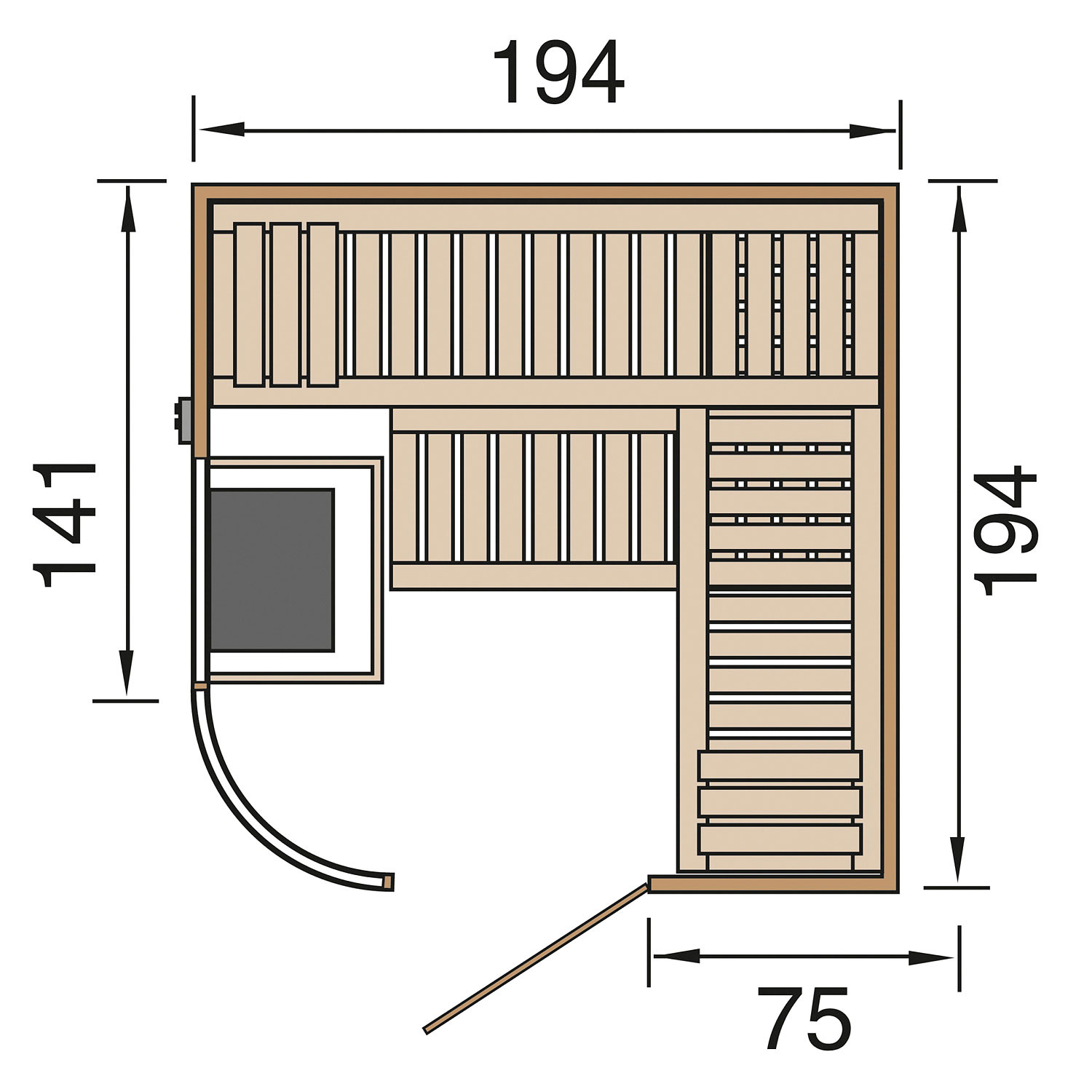 Die Sauna verfügt über ein Außenmaß von 194 cm x 194 cm. Die Grundfläche der Sauna beträgt 3,69 m².
