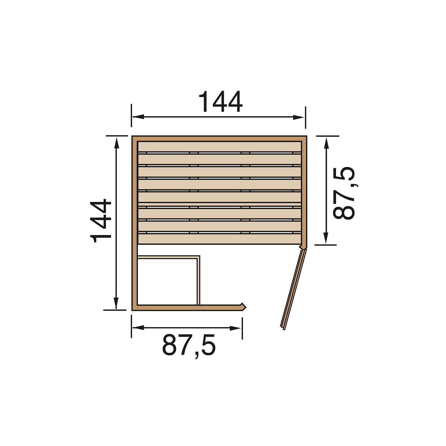 Die Sauna verfügt über ein Außenmaß von 194 cm x 194 cm. Die Grundfläche der Sauna beträgt 3,69 m².