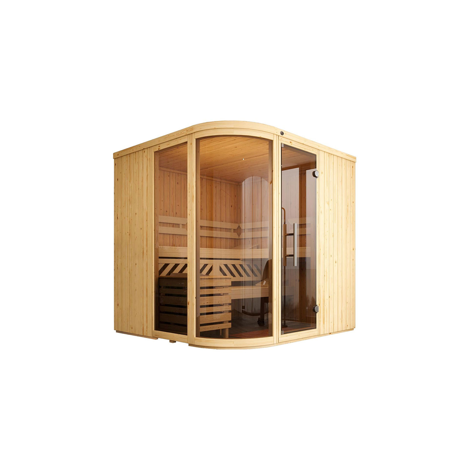 moderne Ganzglastür mit Sicherheitsglas elegant abgerundete Glasfront inklusive 7,5 kW BioS Saunaofen, digitaler Steuerung und Silikonanschlusskabel eine 55 cm tiefe Liege, 50 cm...