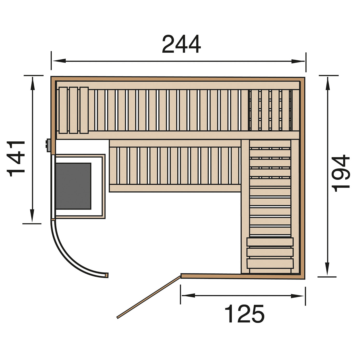 Die Sauna verfügt über ein Außenmaß von 244 cm x 194 cm. Die Grundfläche der Sauna beträgt 4,65 m².