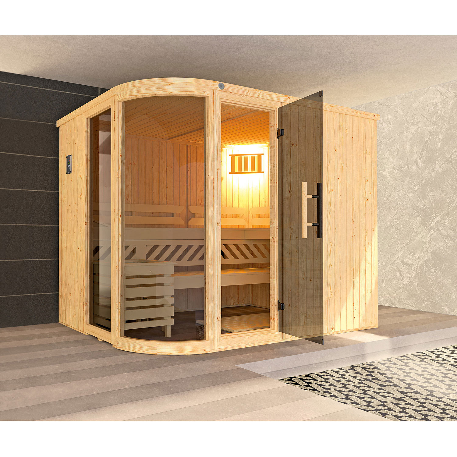 moderne Ganzglastür mit Sicherheitsglas elegant abgerundete Glasfront inklusive 9 kW BioS Saunaofen, digitaler Steuerung und Silikonanschlusskabel eine 55 cm tiefe Liege, 50 cm tiefe...