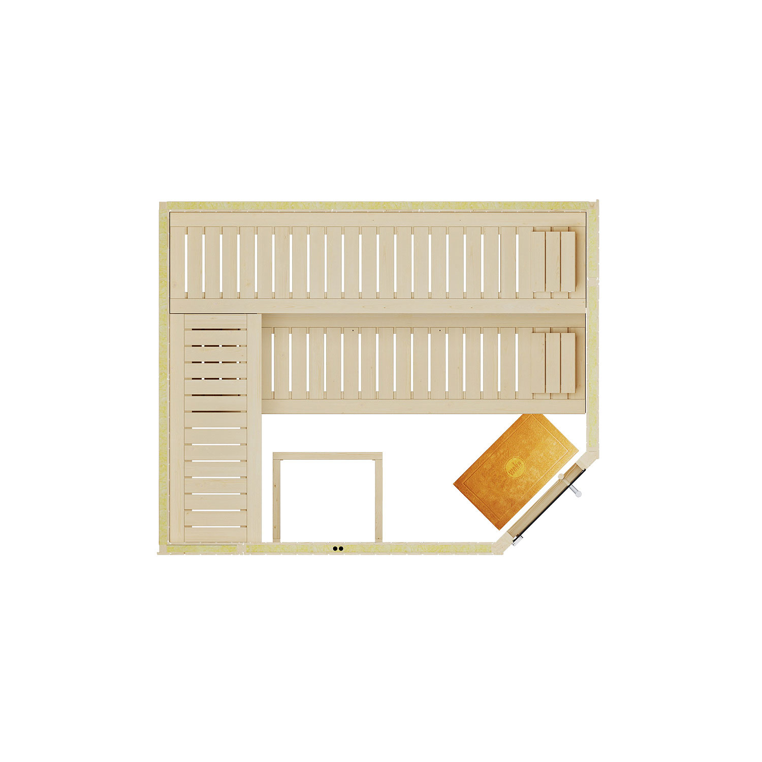 Die Sauna verfügt über ein Außenmaß von 244 cm x 194 cm. Die Grundfläche der Sauna beträgt 4,65 m².
