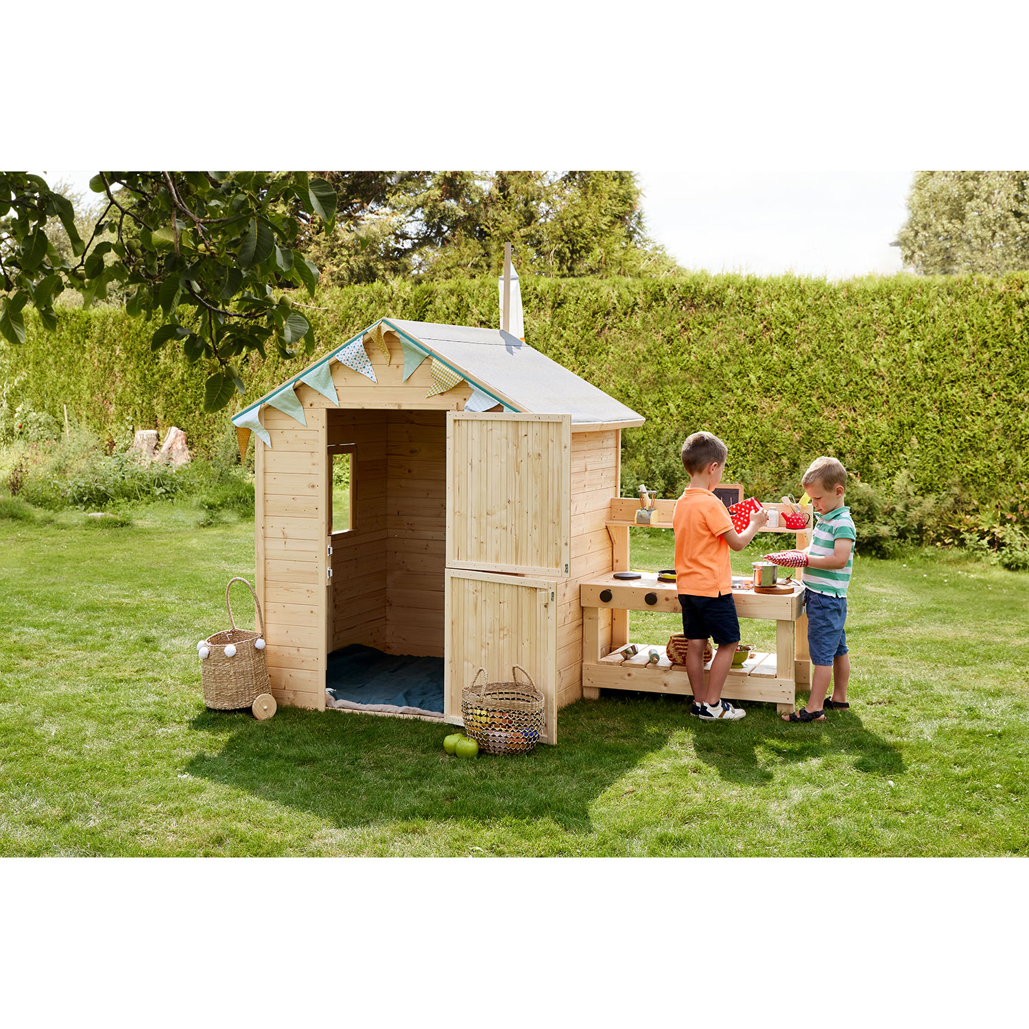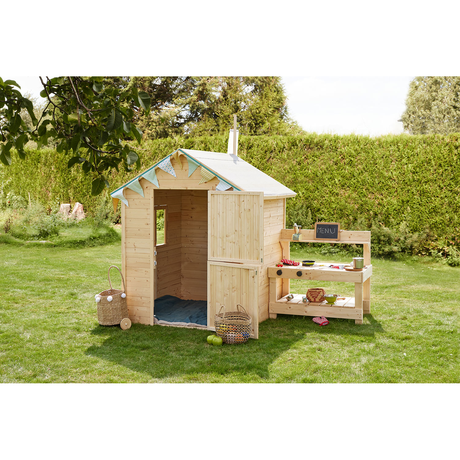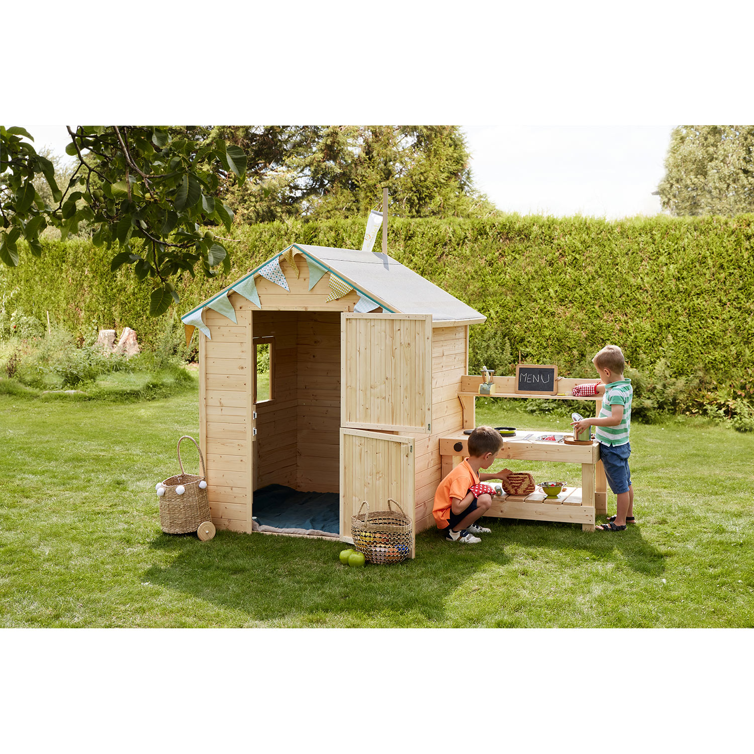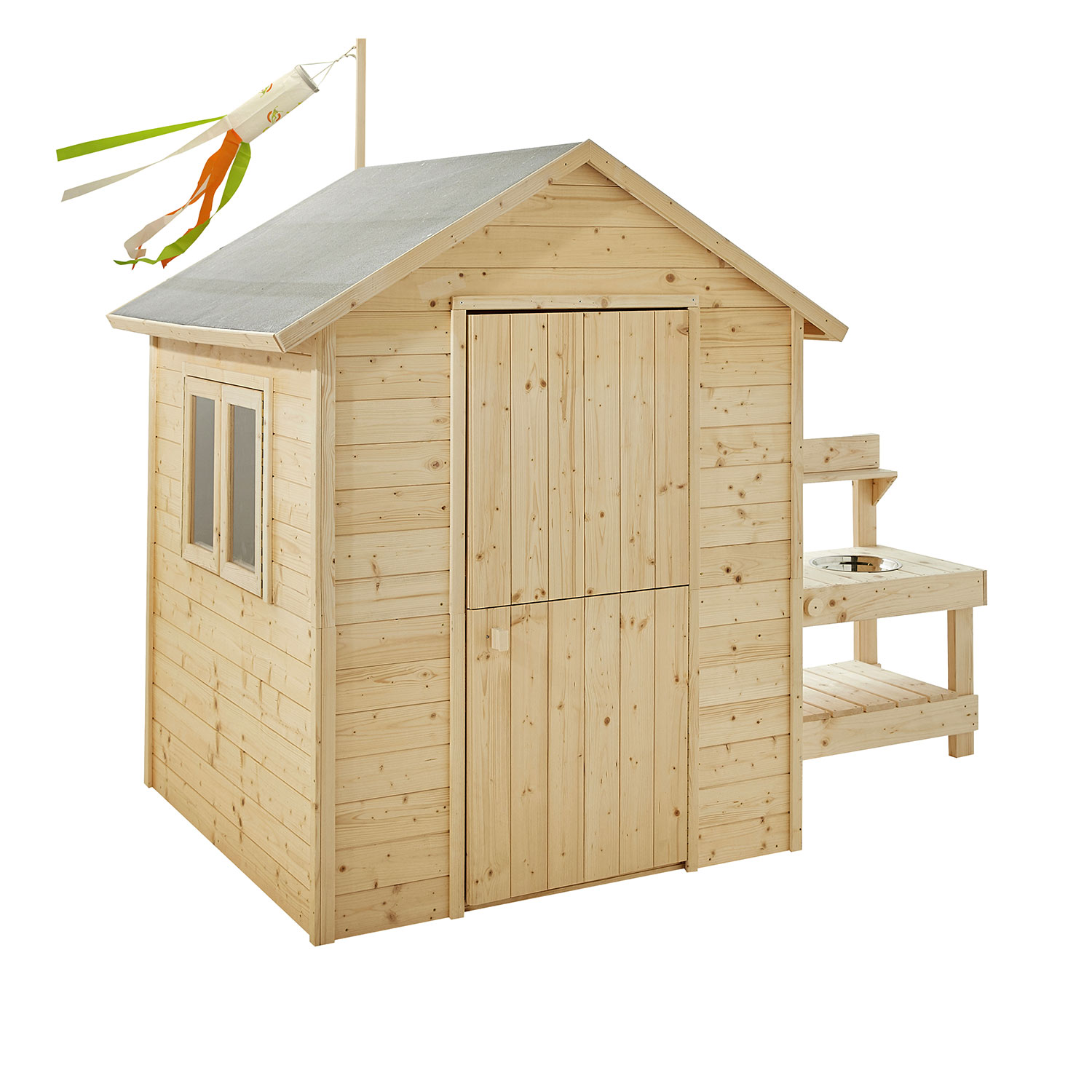 Das Kinderspielhaus Arvid mit eingebauter Küche wird von jedem Kind geliebt. Es wird der neue Ort für abenteuerliche Tage. Ob zum Freunde treffen, basteln oder als Rückzugsort: Es wird der neue Lieblingsplatz Ihrer Kinder sein. Sie erhalten das Spielhaus unbehandelt, ein Anstrich nach Erhalt wird empfohlen.