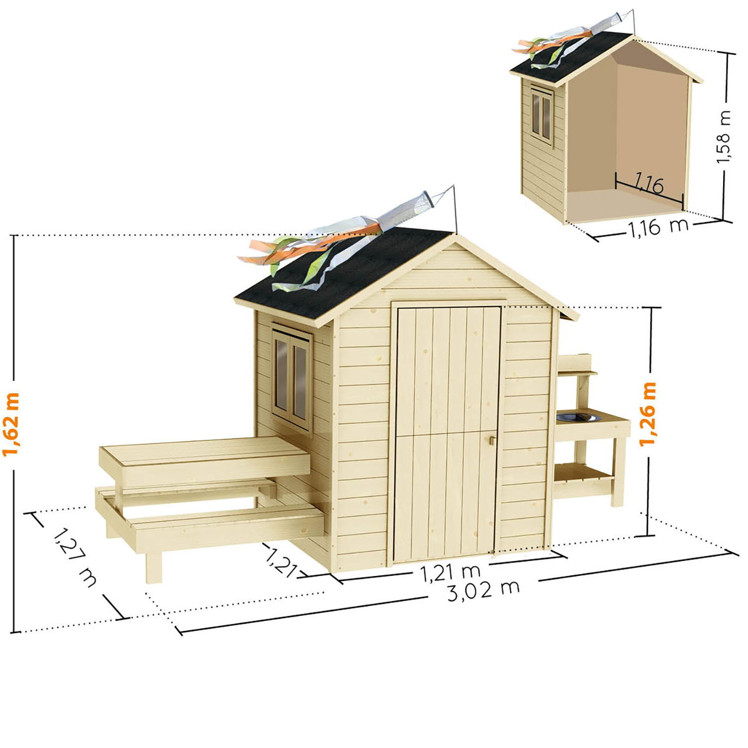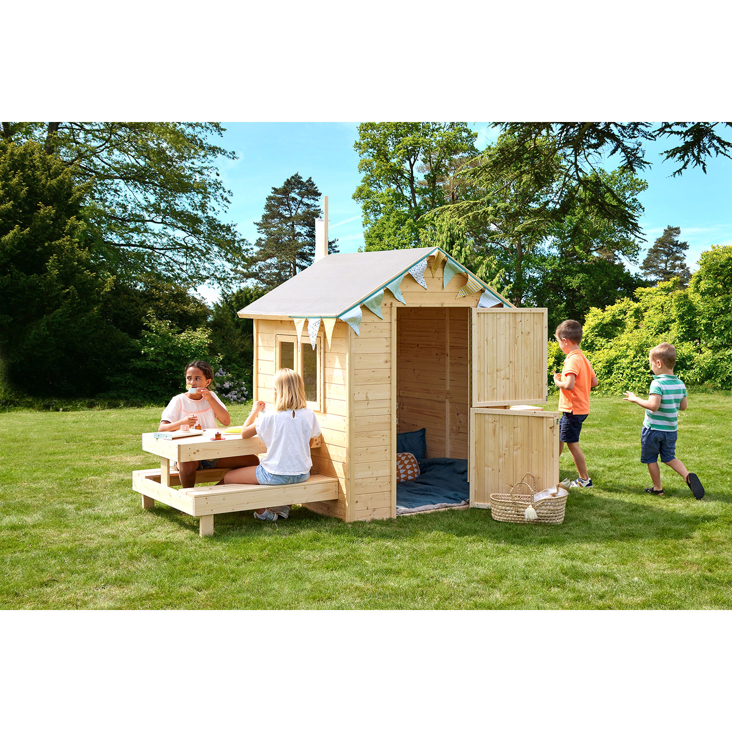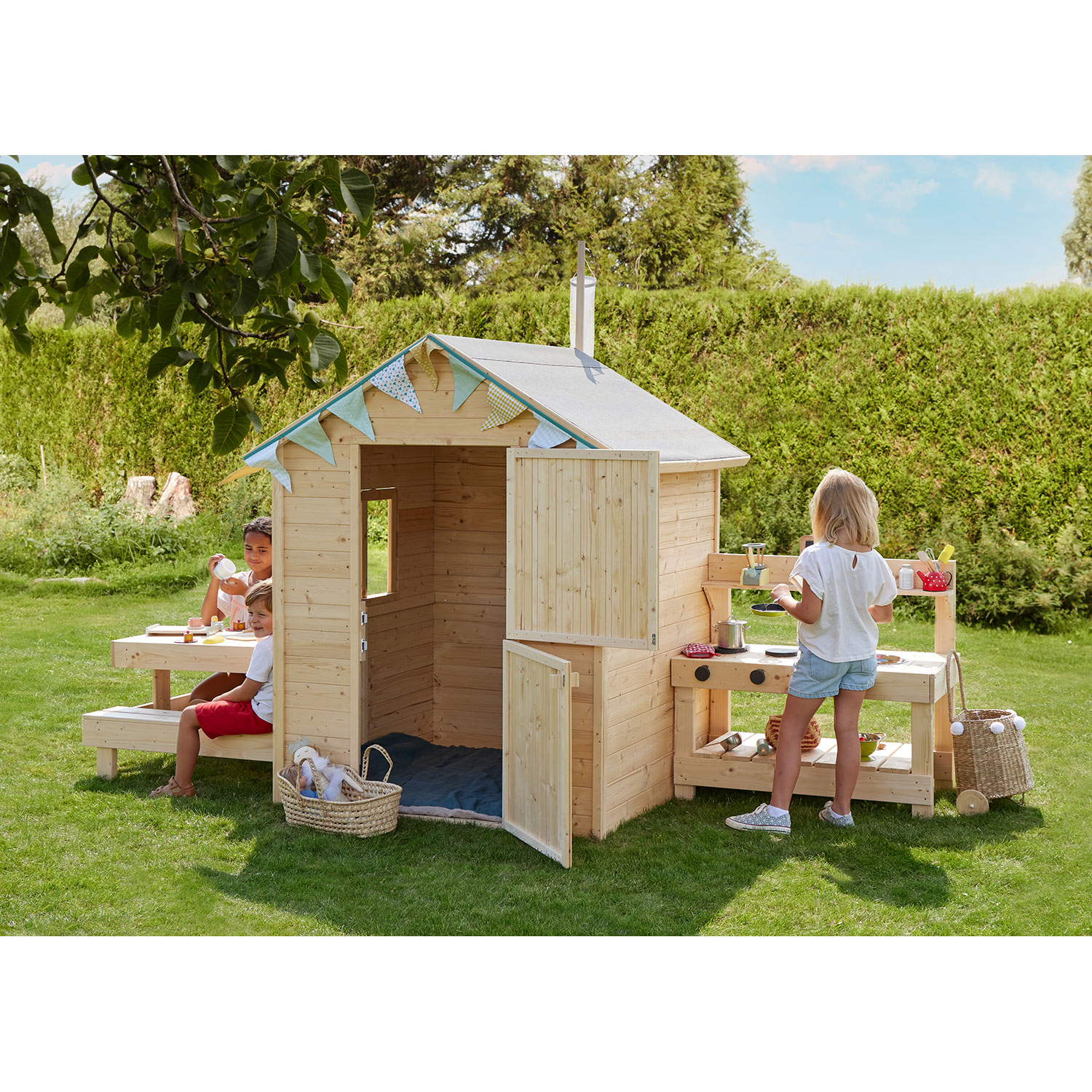 Das Kinderspielhaus Vala mit eingebauter Küche und gemütlichen Picknicktisch wird von jedem Kind geliebt. Es wird der neue Ort für abenteuerliche Tage. Ob zum Freunde treffen, basteln oder als Rückzugsort: Es wird der neue Lieblingsplatz Ihrer Kinder sein. Sie erhalten das Spielhaus unbehandelt, ein Anstrich nach Erhalt wird empfohlen.