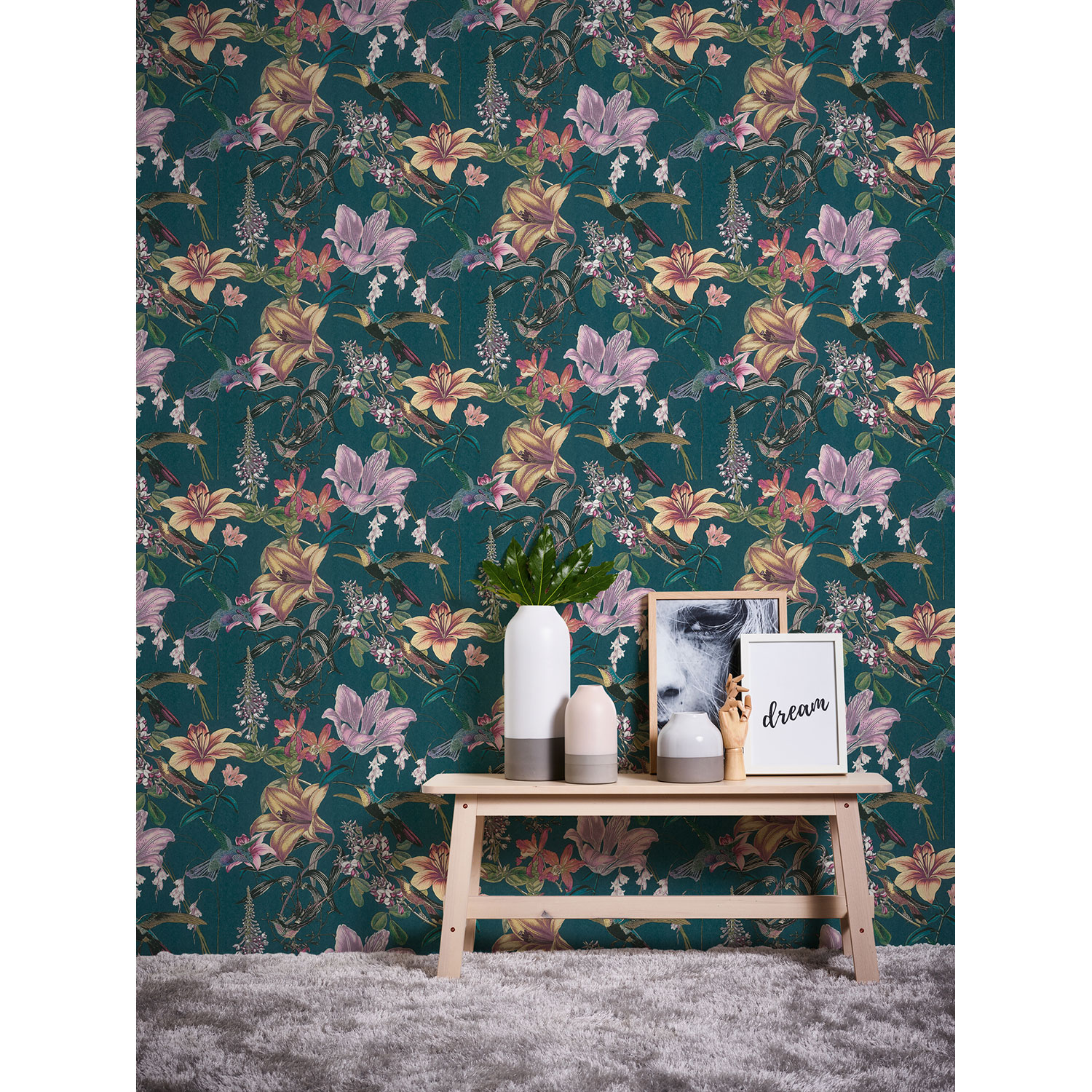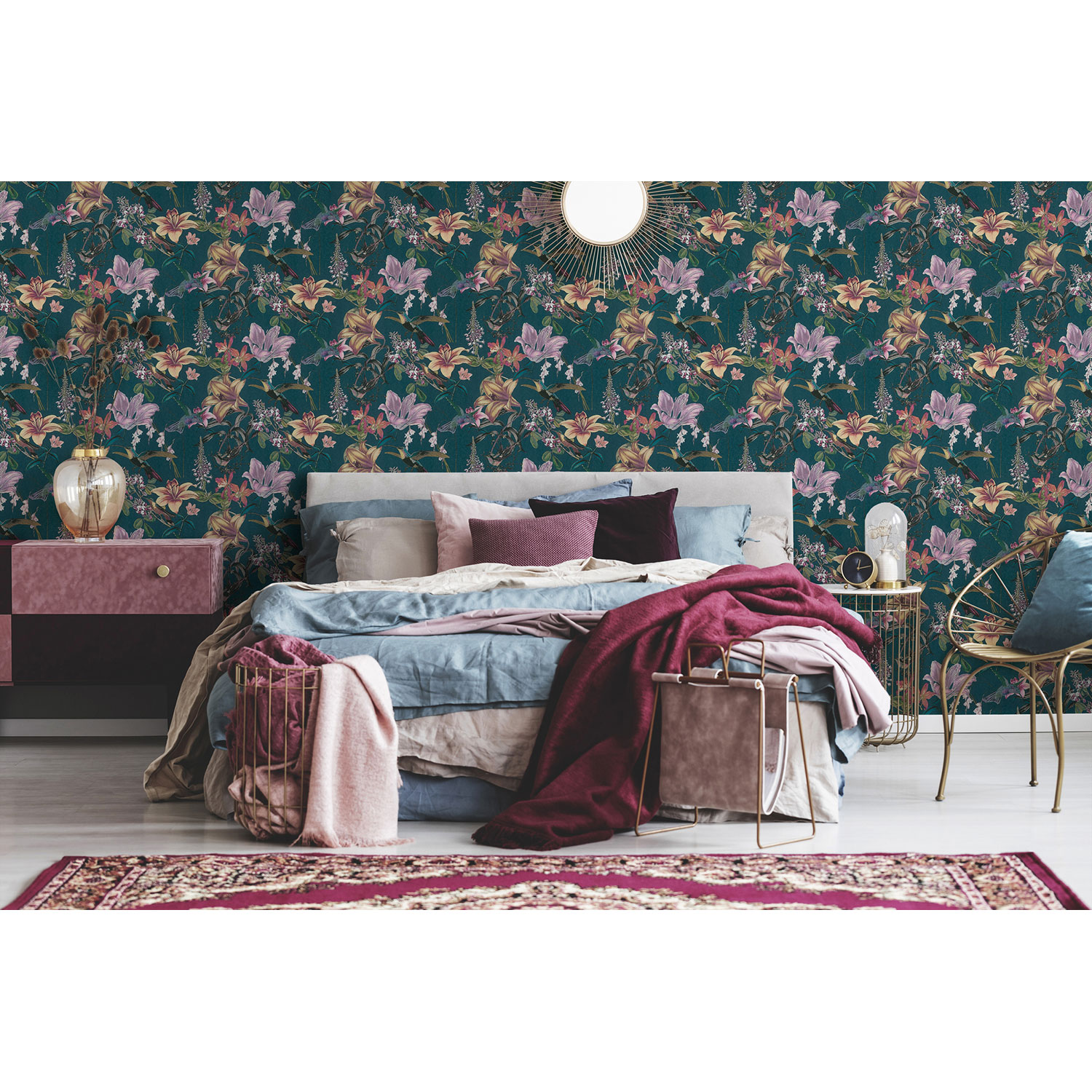 Die Blumentapete von Architects Paper aus der Kollektion "Jungle Chic" strahlt gleichermaßen luxuriösen Charme wie gemütliches Wohngefühl aus.