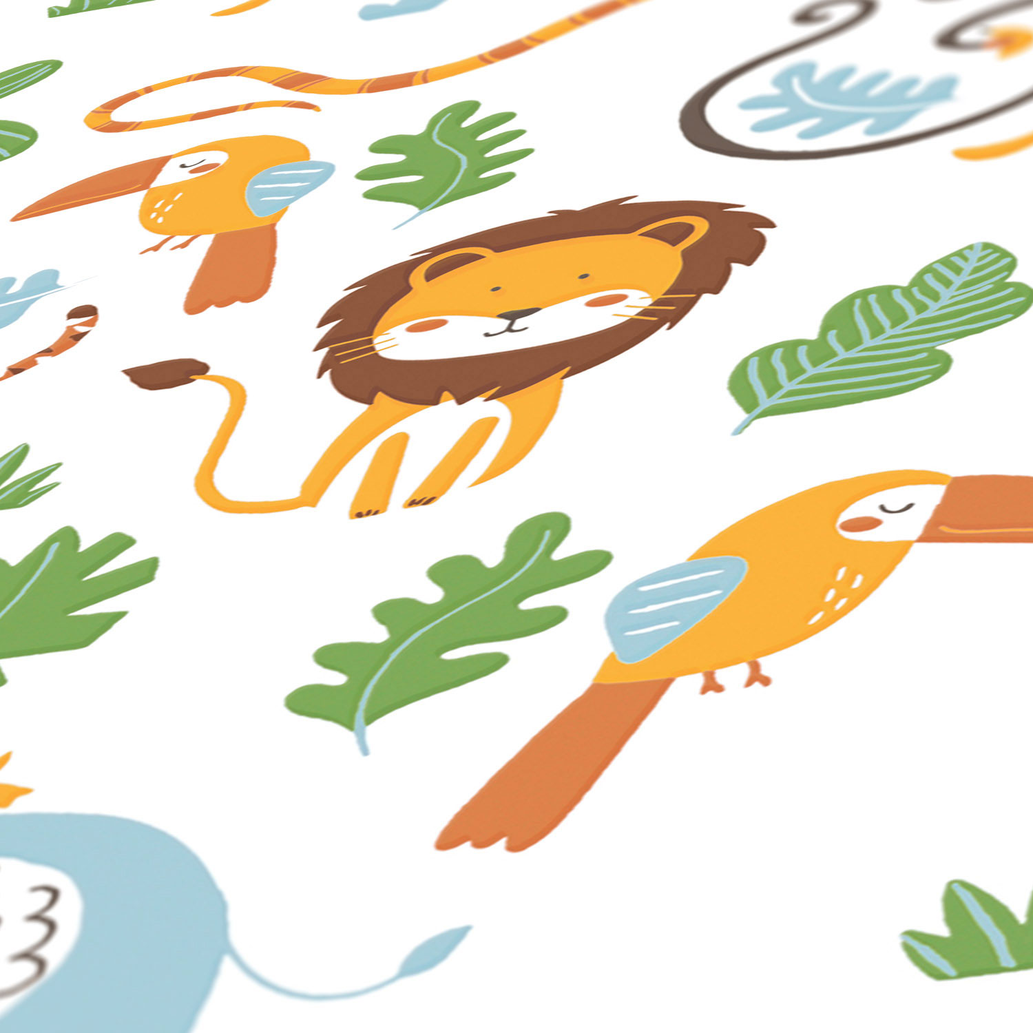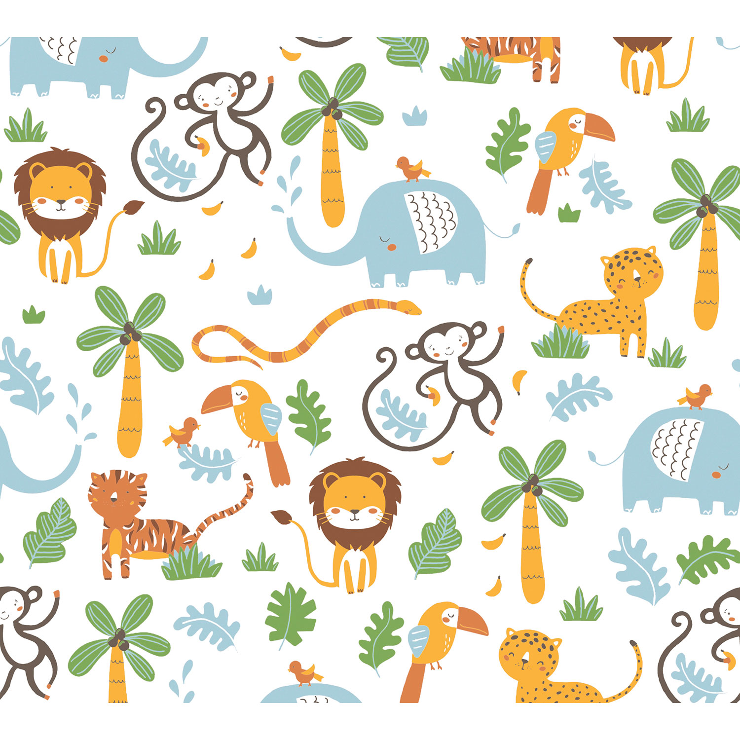 Die Zoomotive und das tropische Flair lässt Kinderherzen höherschlagen. Somit präsentiert sich die Tapete niedlich und fantasievoll.