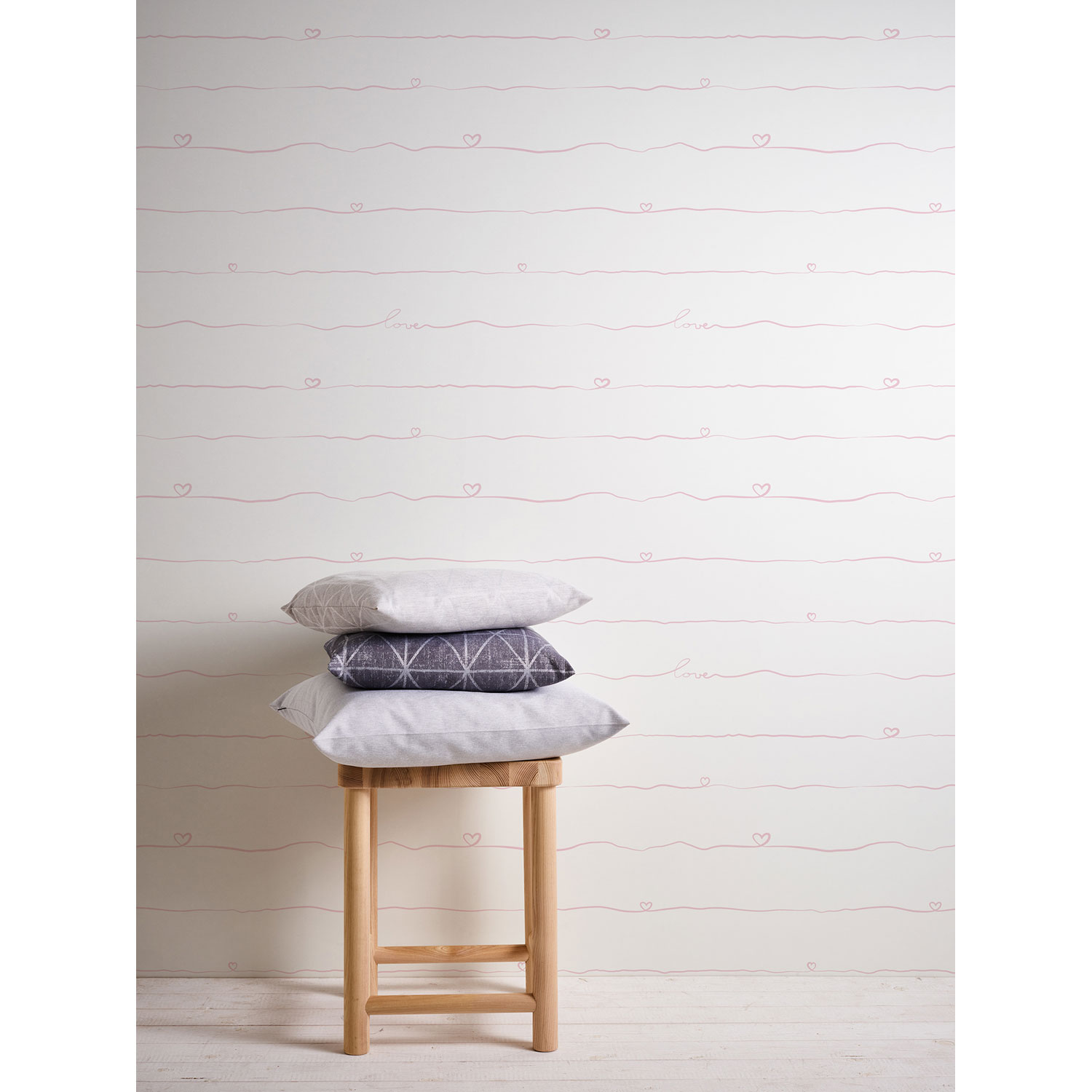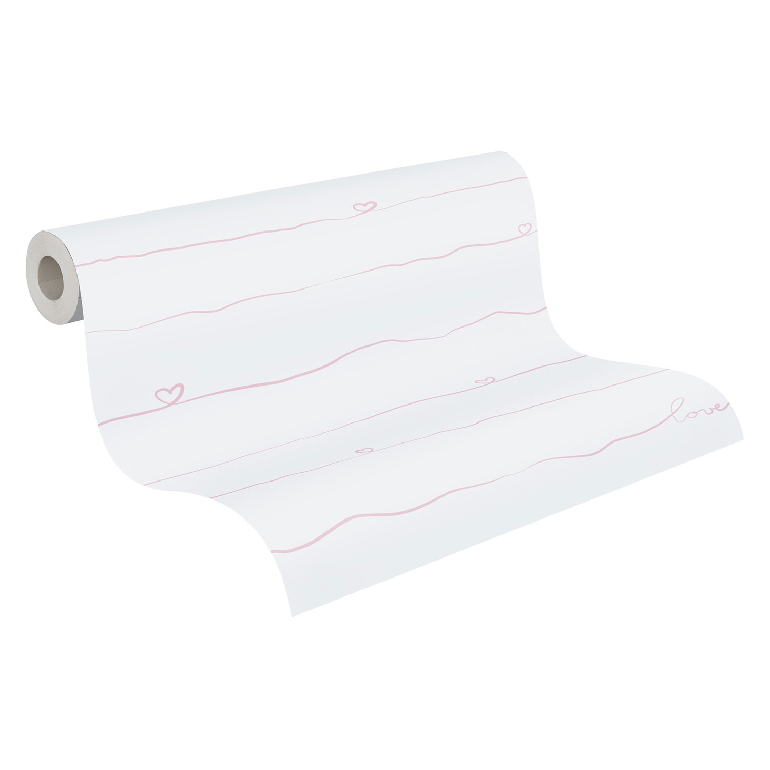 Die Schriftzüge und Herzen lassen Kinderherzen höherschlagen. Somit präsentiert sich die Tapete niedlich und fantasievoll.