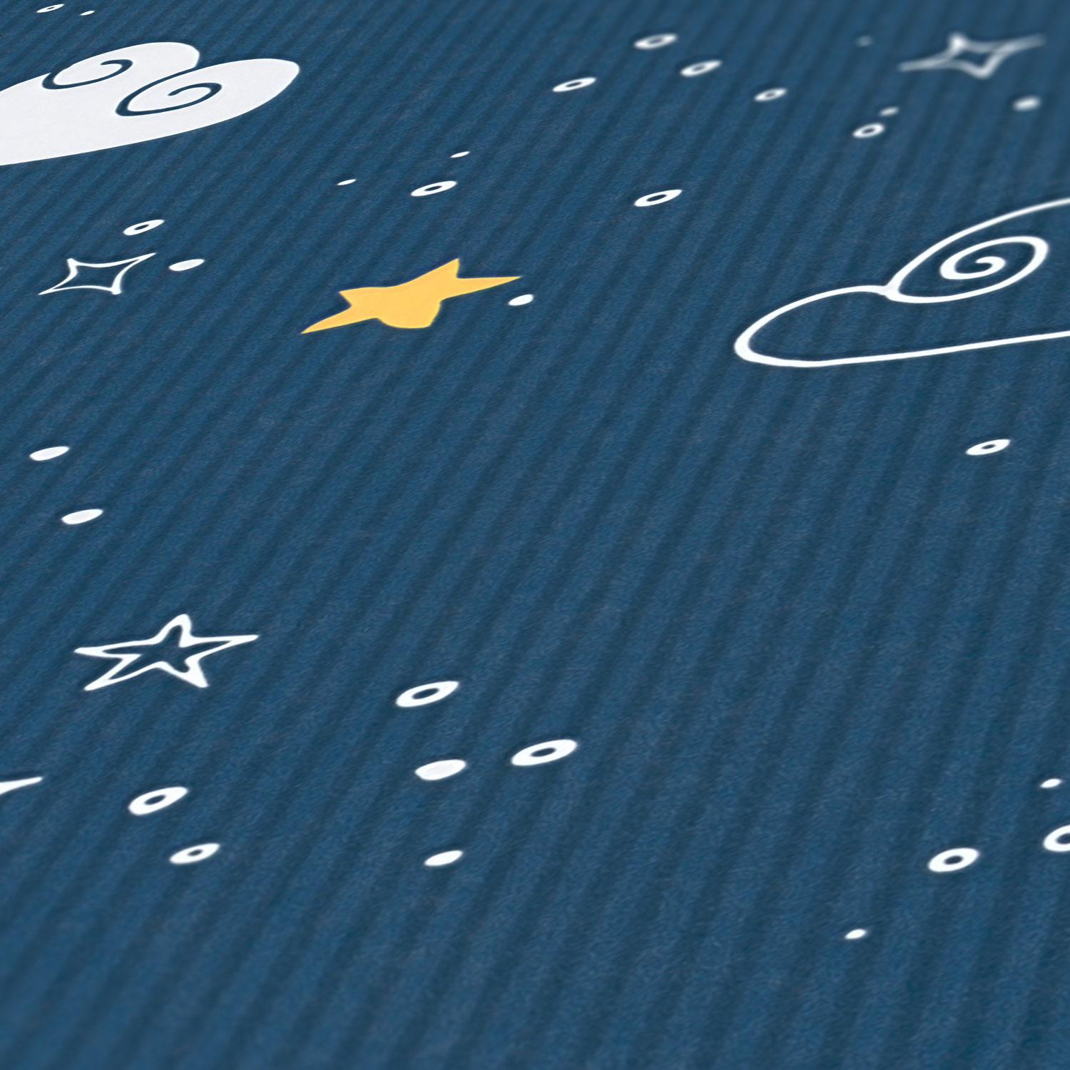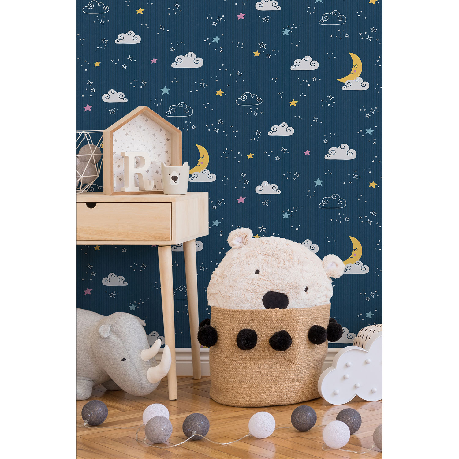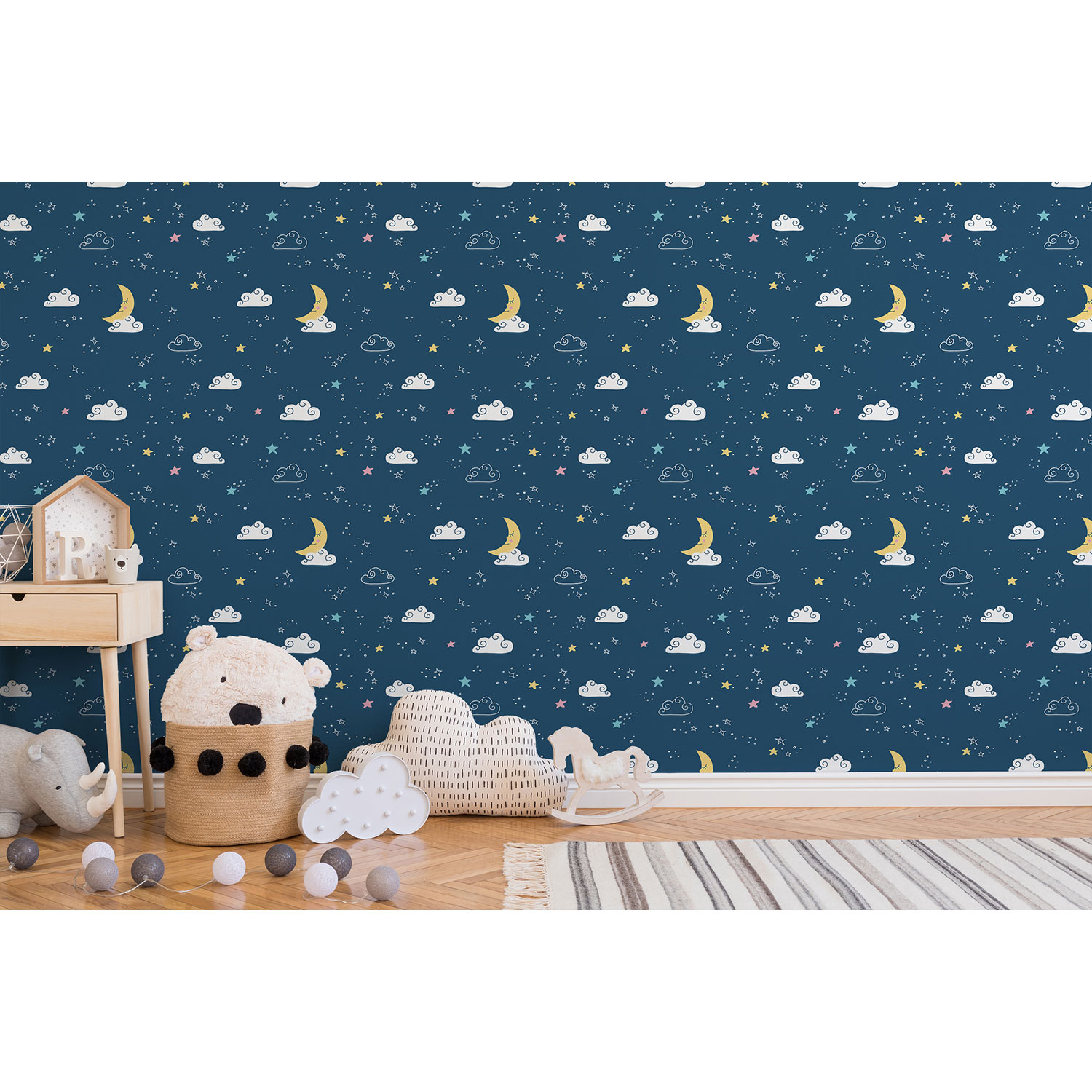 Die Sterne, Mond und Wolken lassen Kinderherzen höherschlagen. Somit präsentiert sich die Tapete niedlich und fantasievoll.