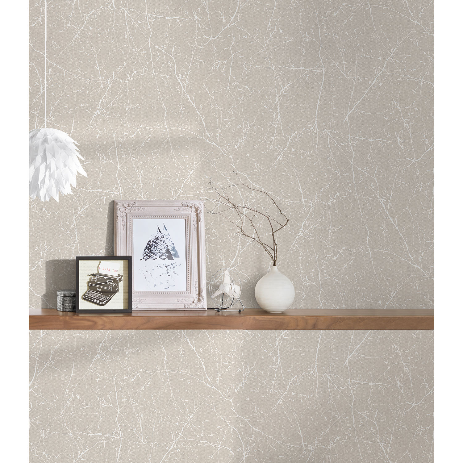 Die Tapete hat feine Textilstrukturen welche für eine wohnliche Atmosphäre sorgen. Das Astmuster sorgt dabei für ein besonders natürlichen Flair.