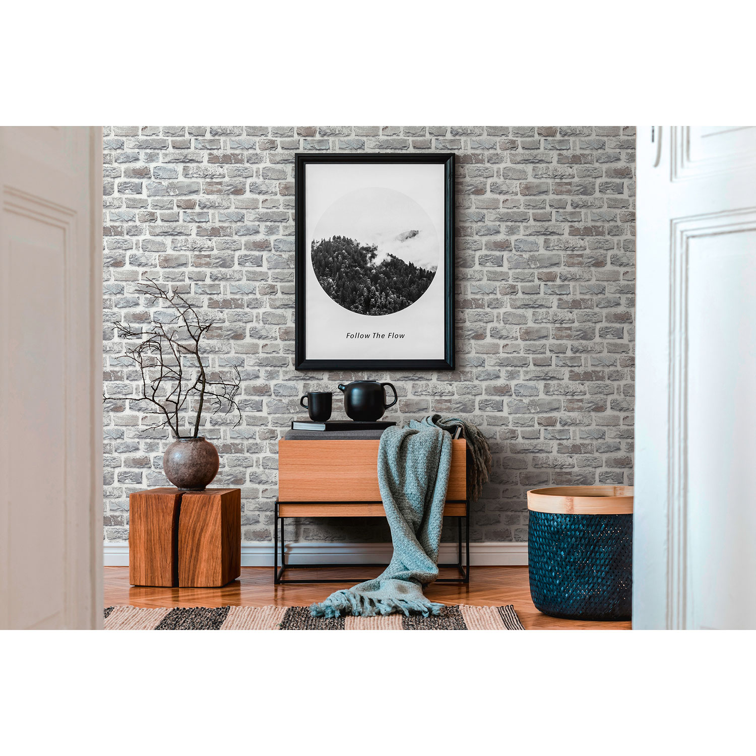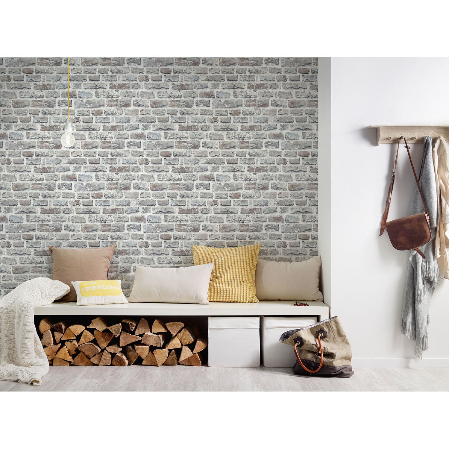 Die Vliestapete beeindruckt mit einem realistischen Muster aus hellen Backsteinen. Sie schafft einen authentischen Loft-Look und verleiht einen Industrie-Charme.