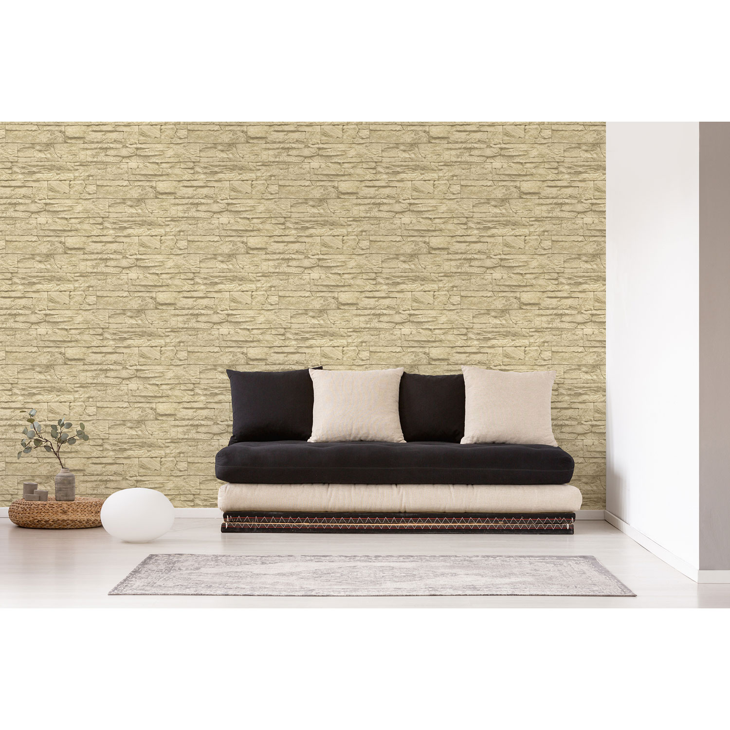 Die Vliestapete beeindruckt mit einem realistischen Muster aus hellen Steinen. Sie schafft einen authentischen Loft-Look und verleiht einen Industrie-Charme.