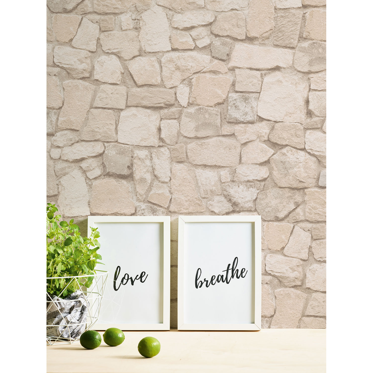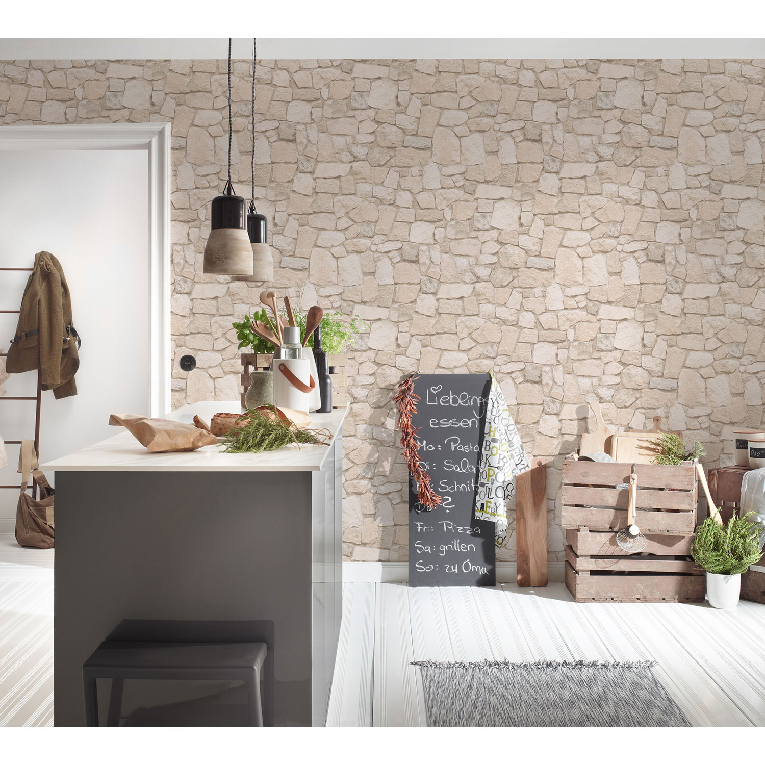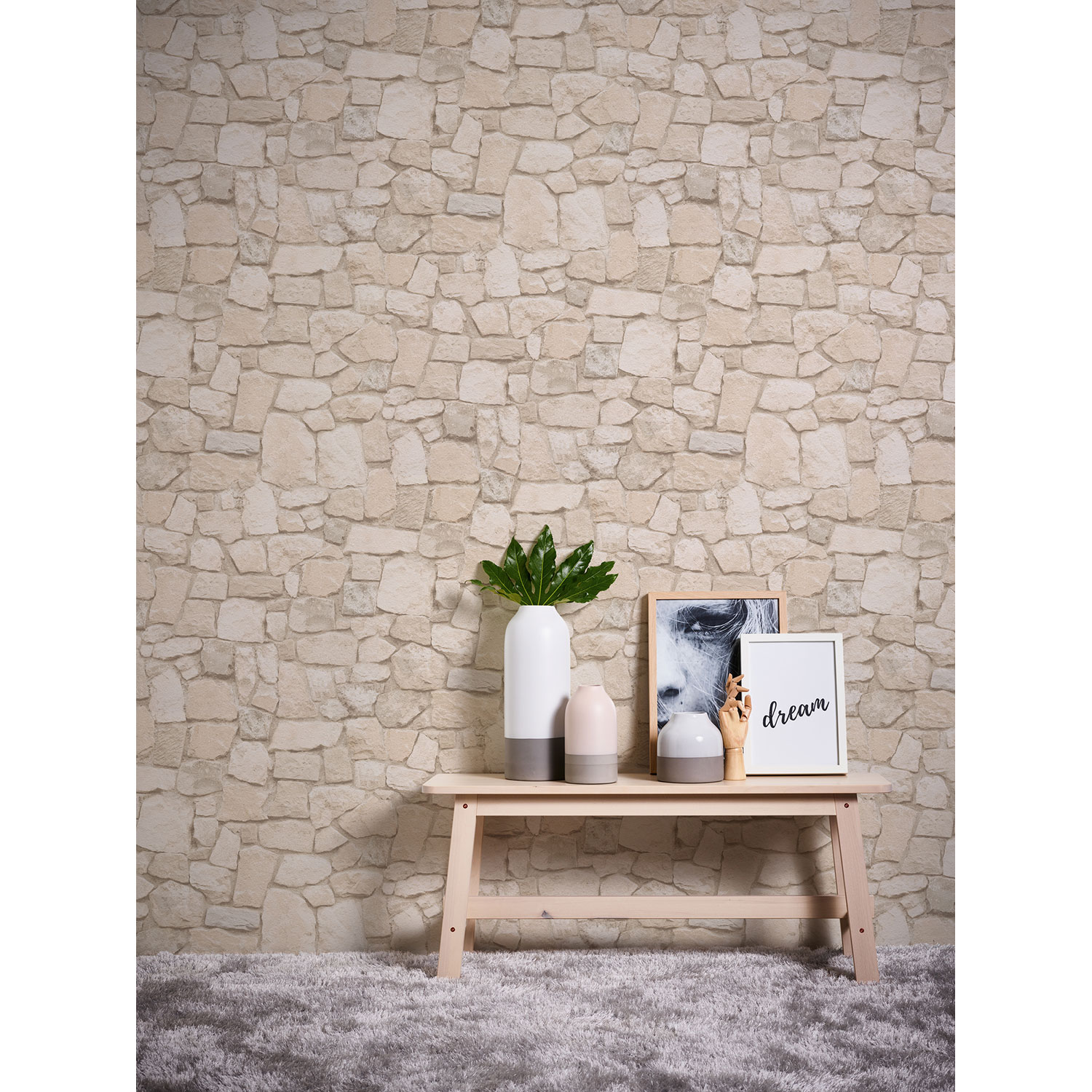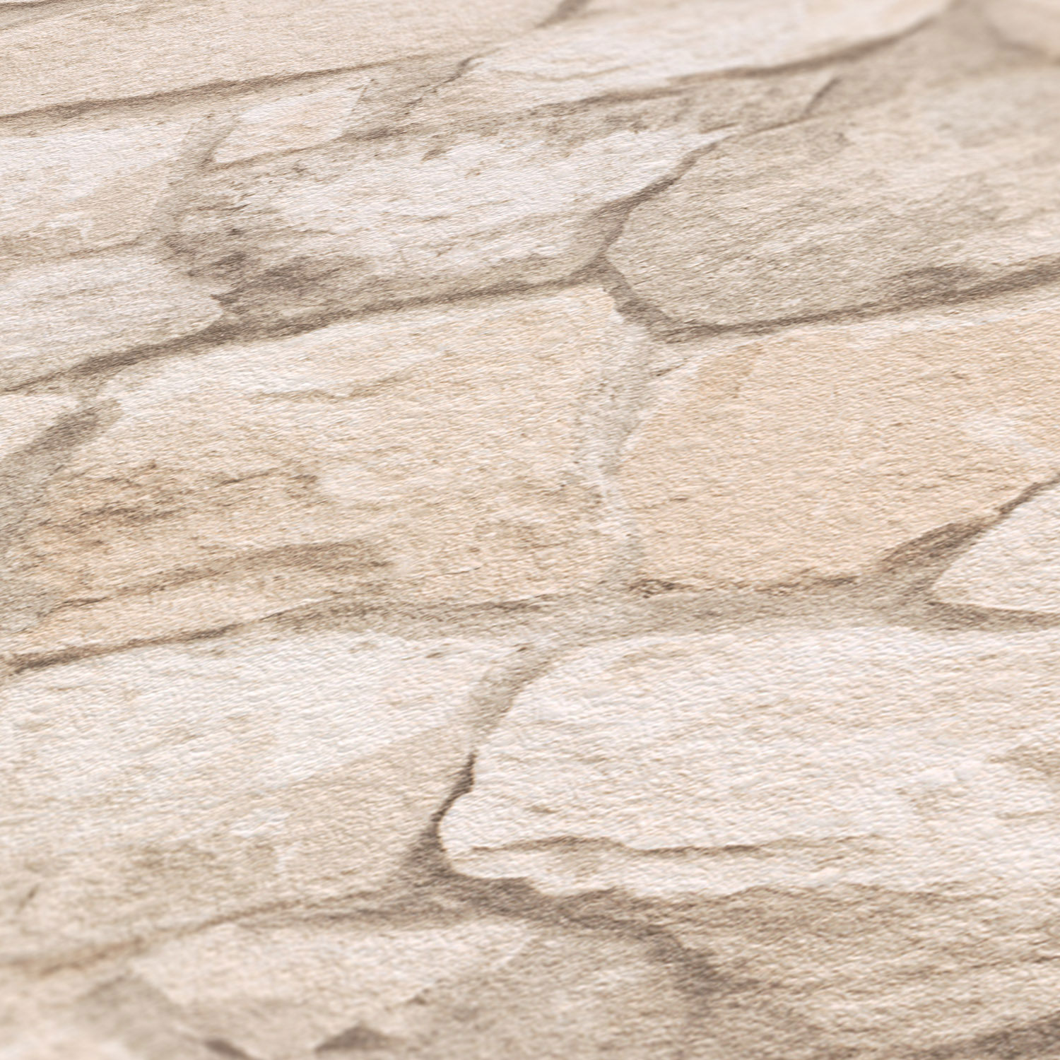 Die hellen Steine und sandfarbenen Fugen sehen täuschend echt aus und vermitteln den Eindruck einer rustikalen Steinwand.