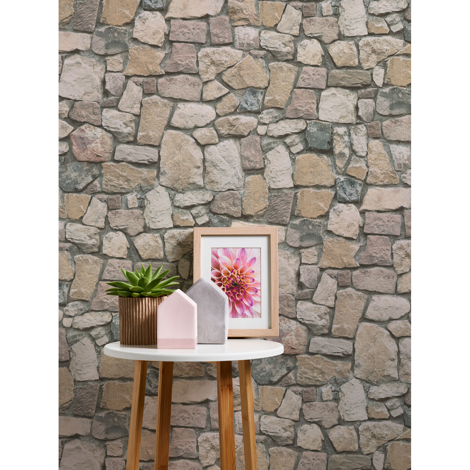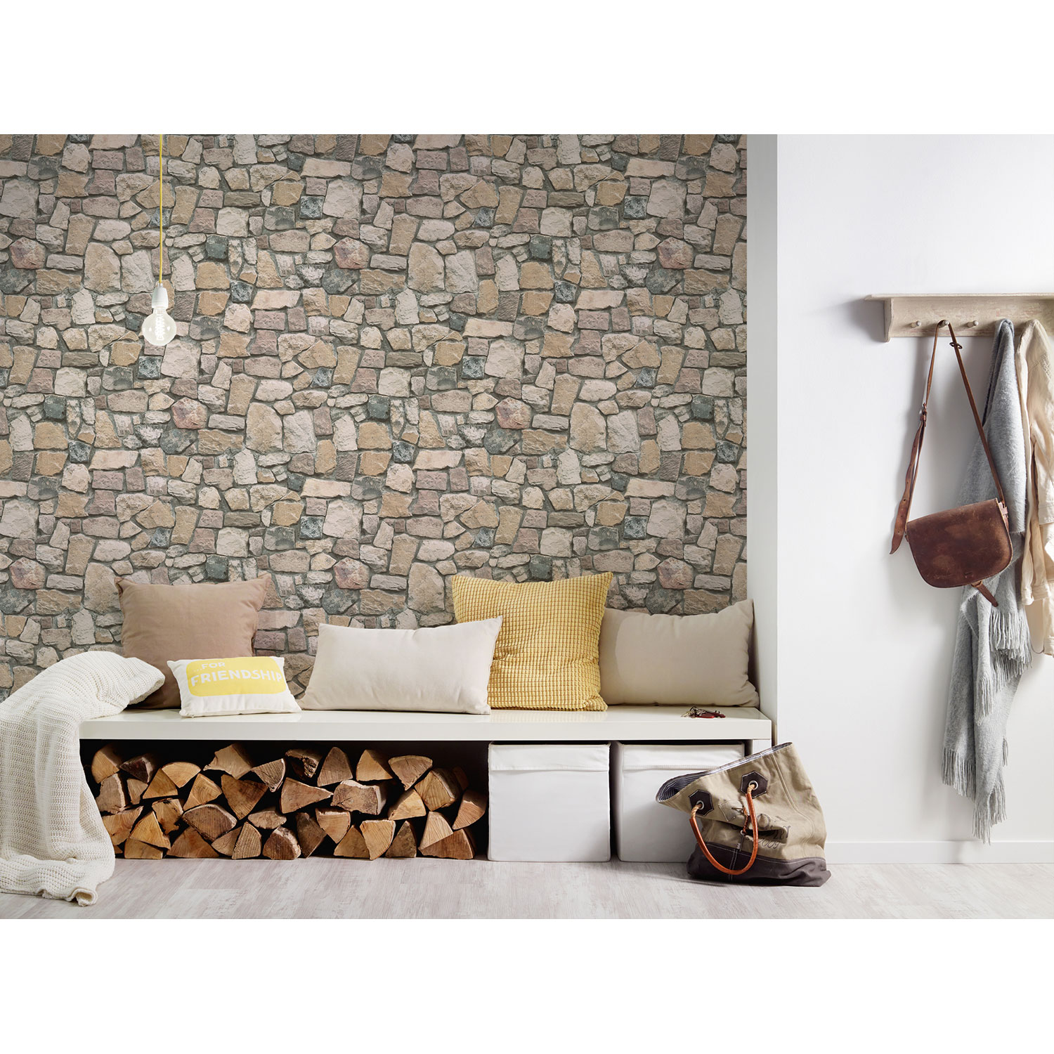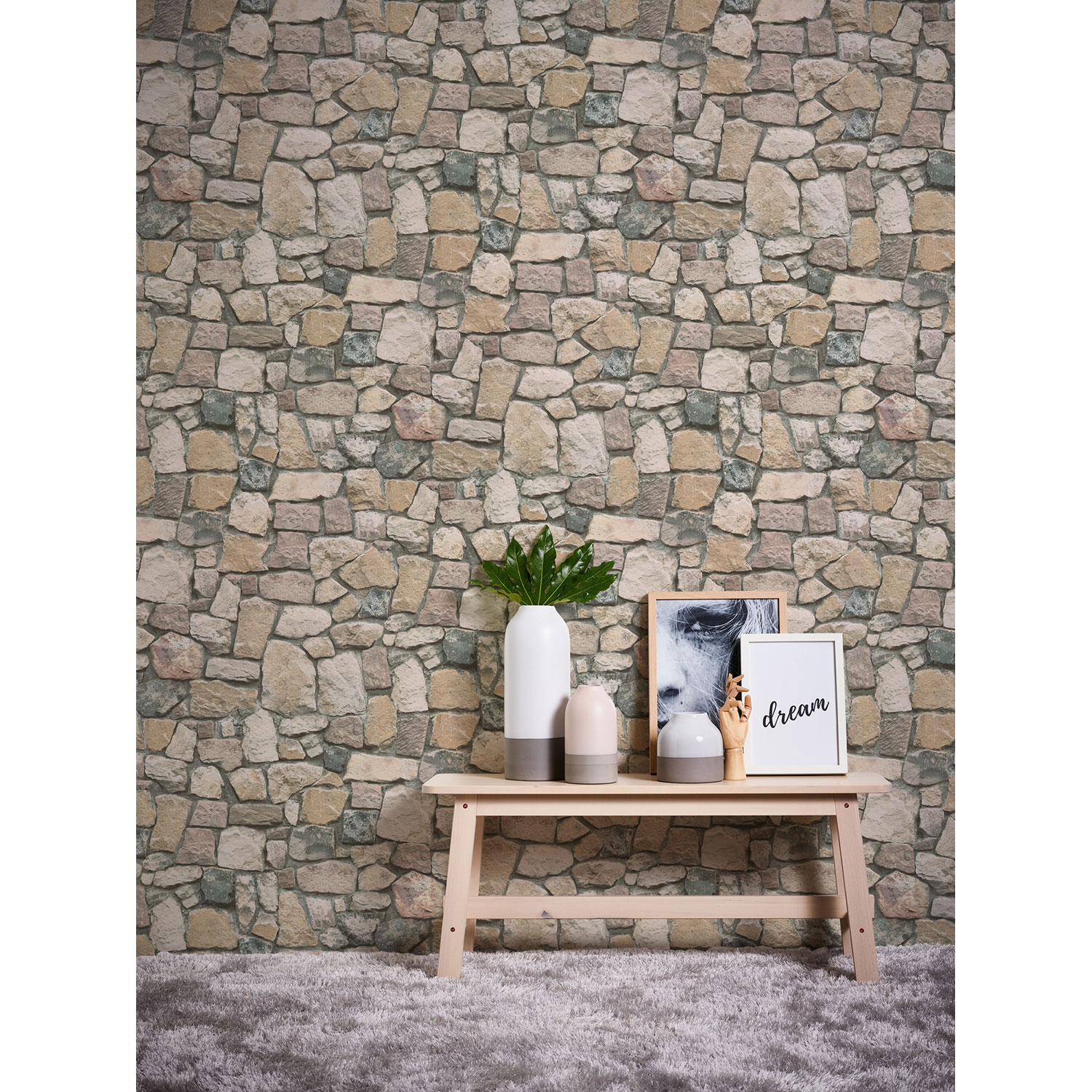 Die Steine und sandfarbenen Fugen sehen täuschend echt aus und vermitteln den Eindruck einer rustikalen Steinwand.