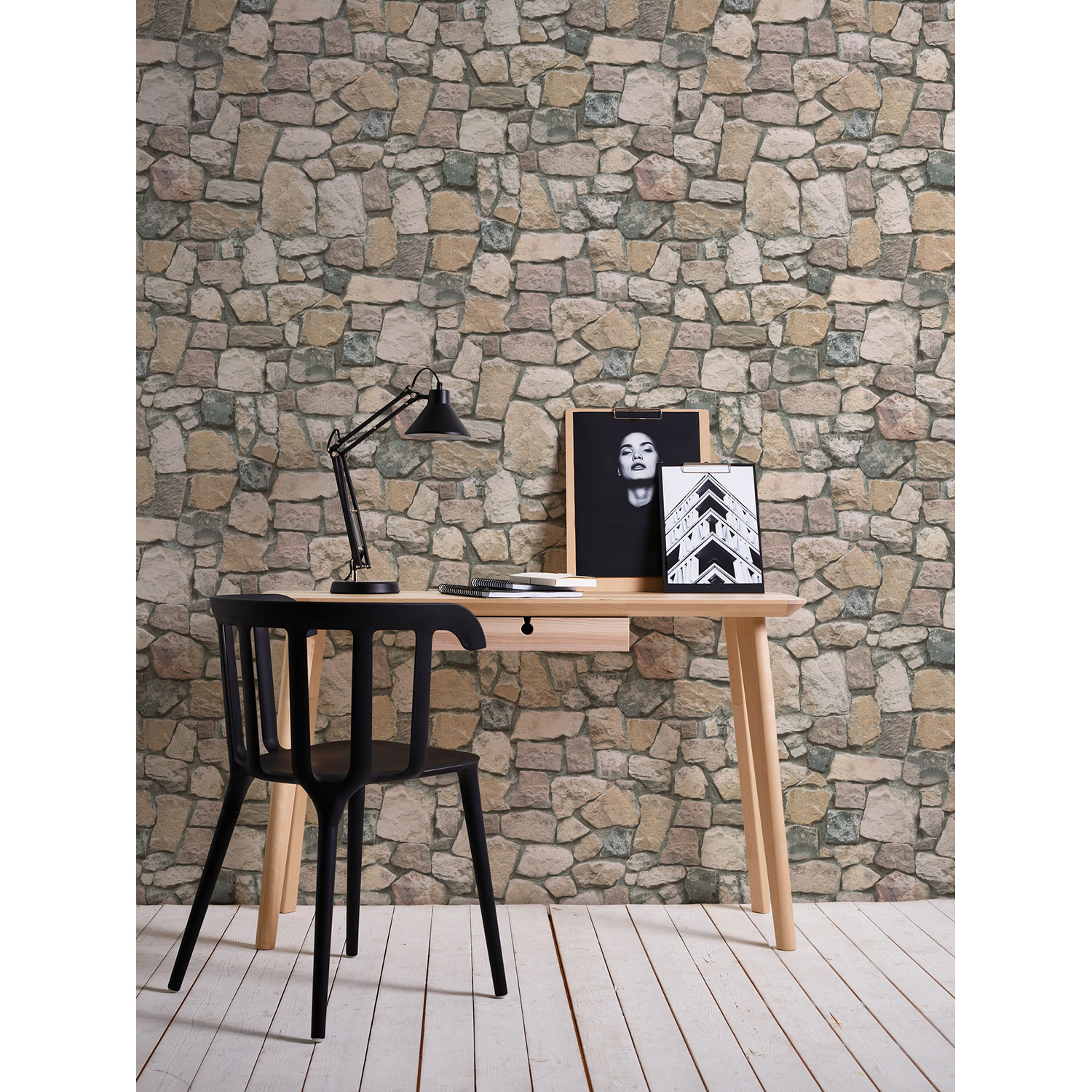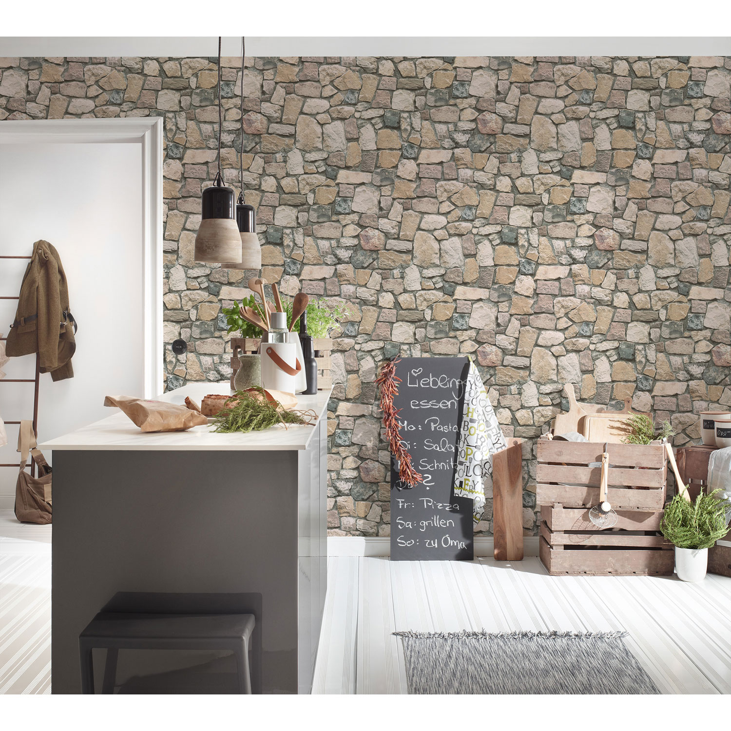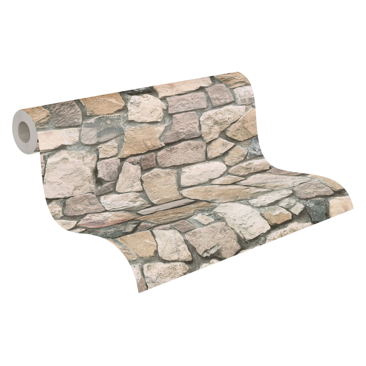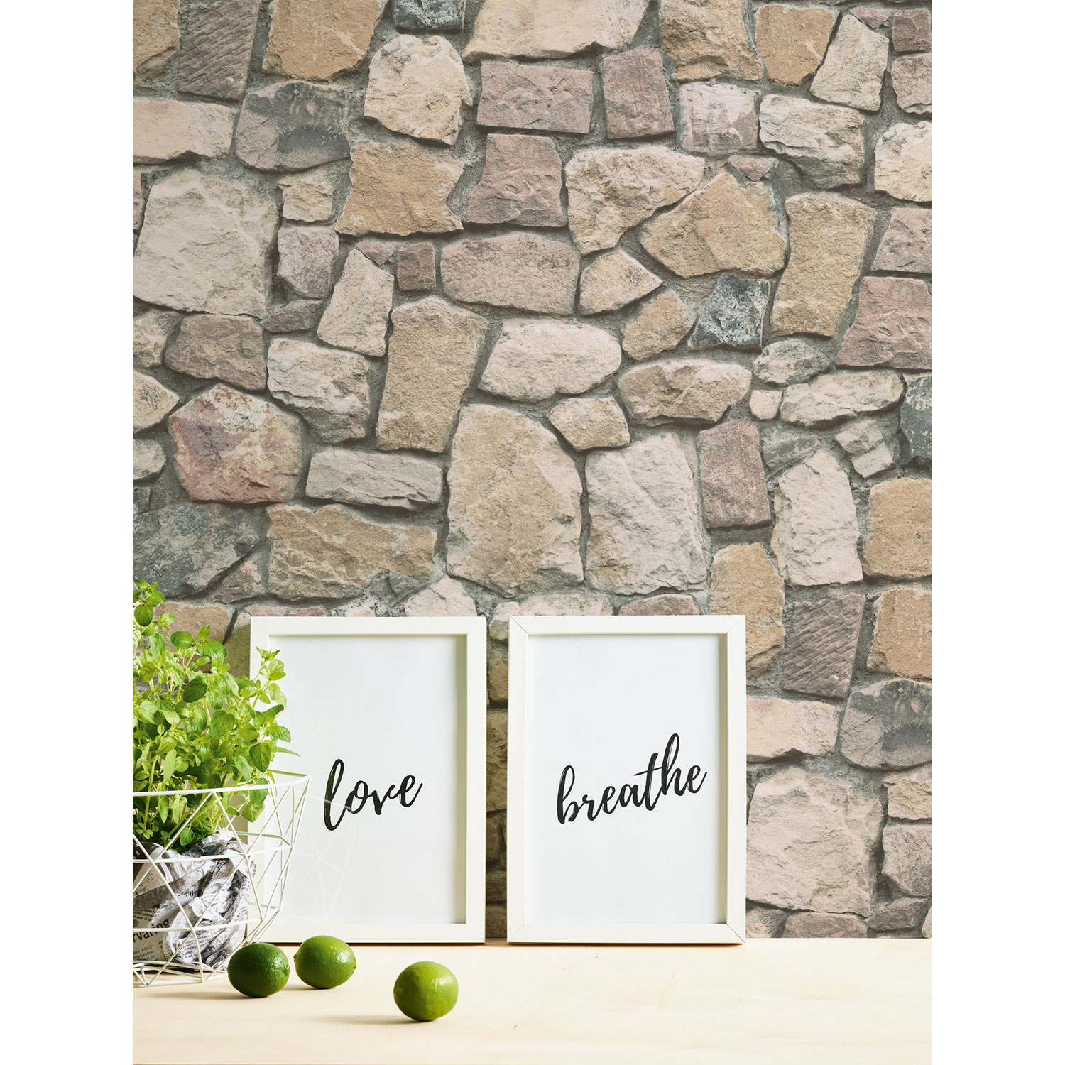 Die Steine und sandfarbenen Fugen sehen täuschend echt aus und vermitteln den Eindruck einer rustikalen Steinwand.