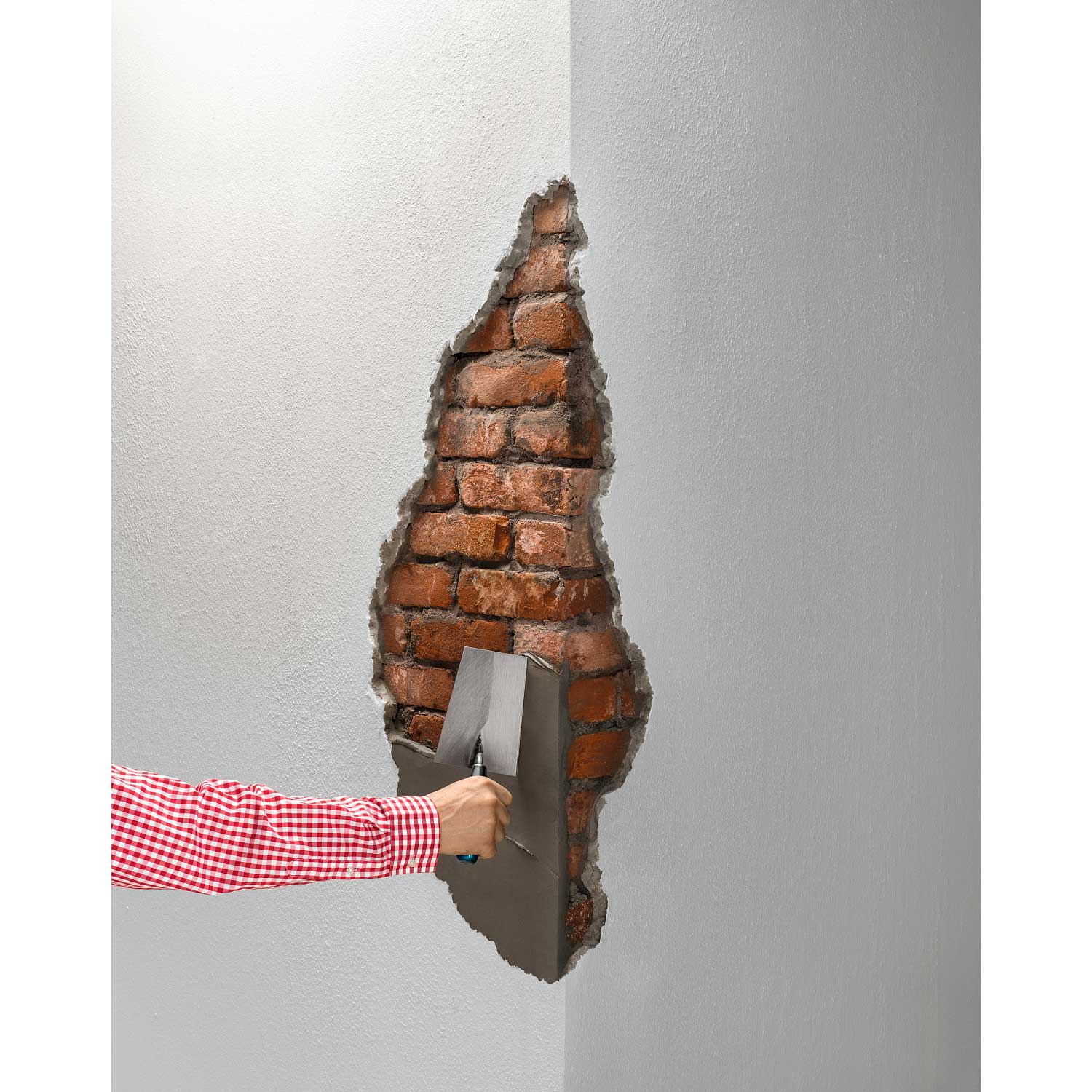 • Putzausbruch reparieren: R & R mit der Kelle oder Glätter aufziehen. Nach 20-40 Minuten mit Schwamm- oder Filzbrett und wenig Wasser nacharbeiten.