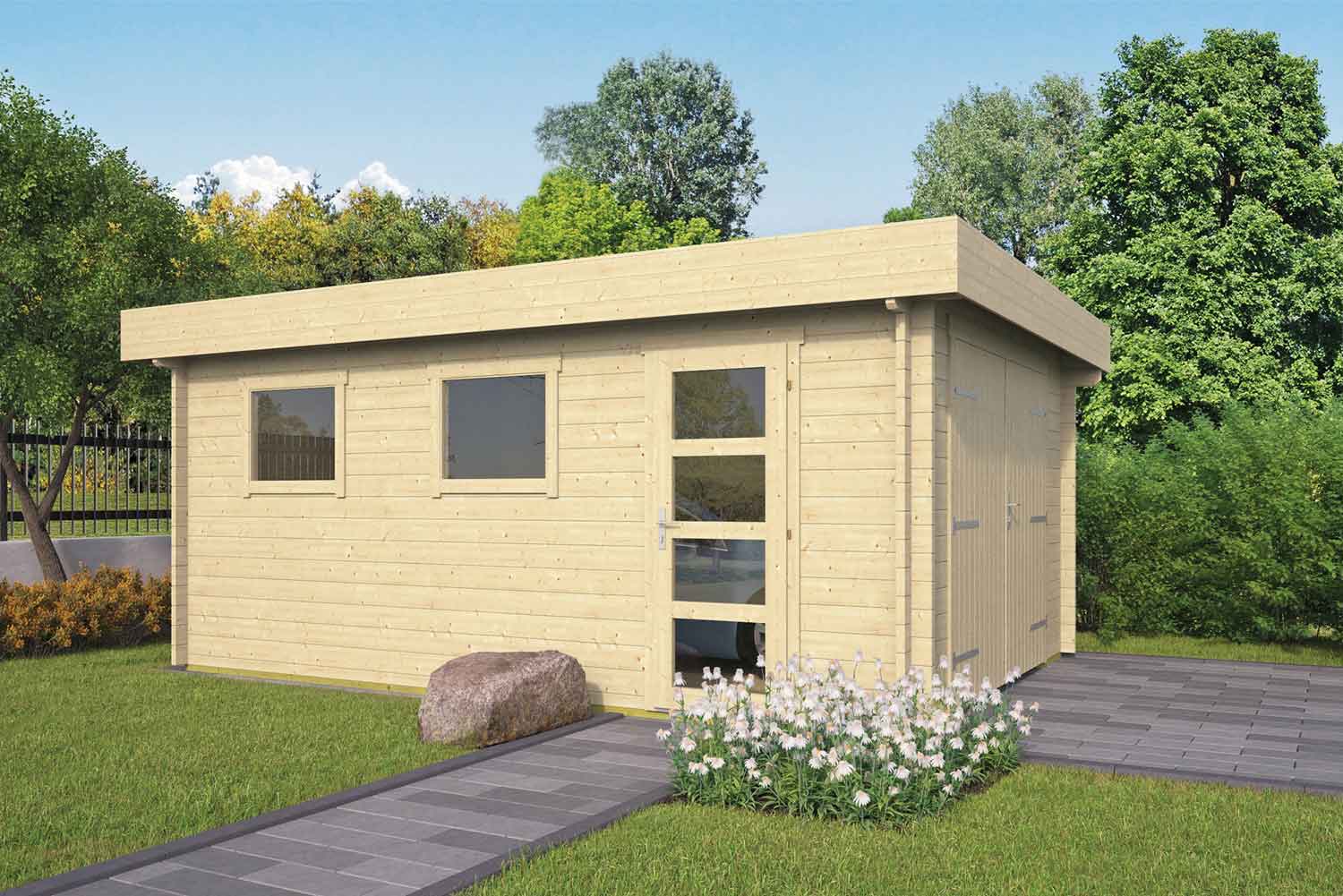 Die praktische Garage mit Flachdach wird unbehandelt geliefert. So haben Sie die Möglichkeit das Haus an Ihre Wünsche anzupassen. Auf 18,5 m² können Sie ein Fahrzeug oder auch Geräte und Gartenmöbel unterzubringen. Fenster und Seitentür sorgen für viel in dem 40,7 m³ Raum.