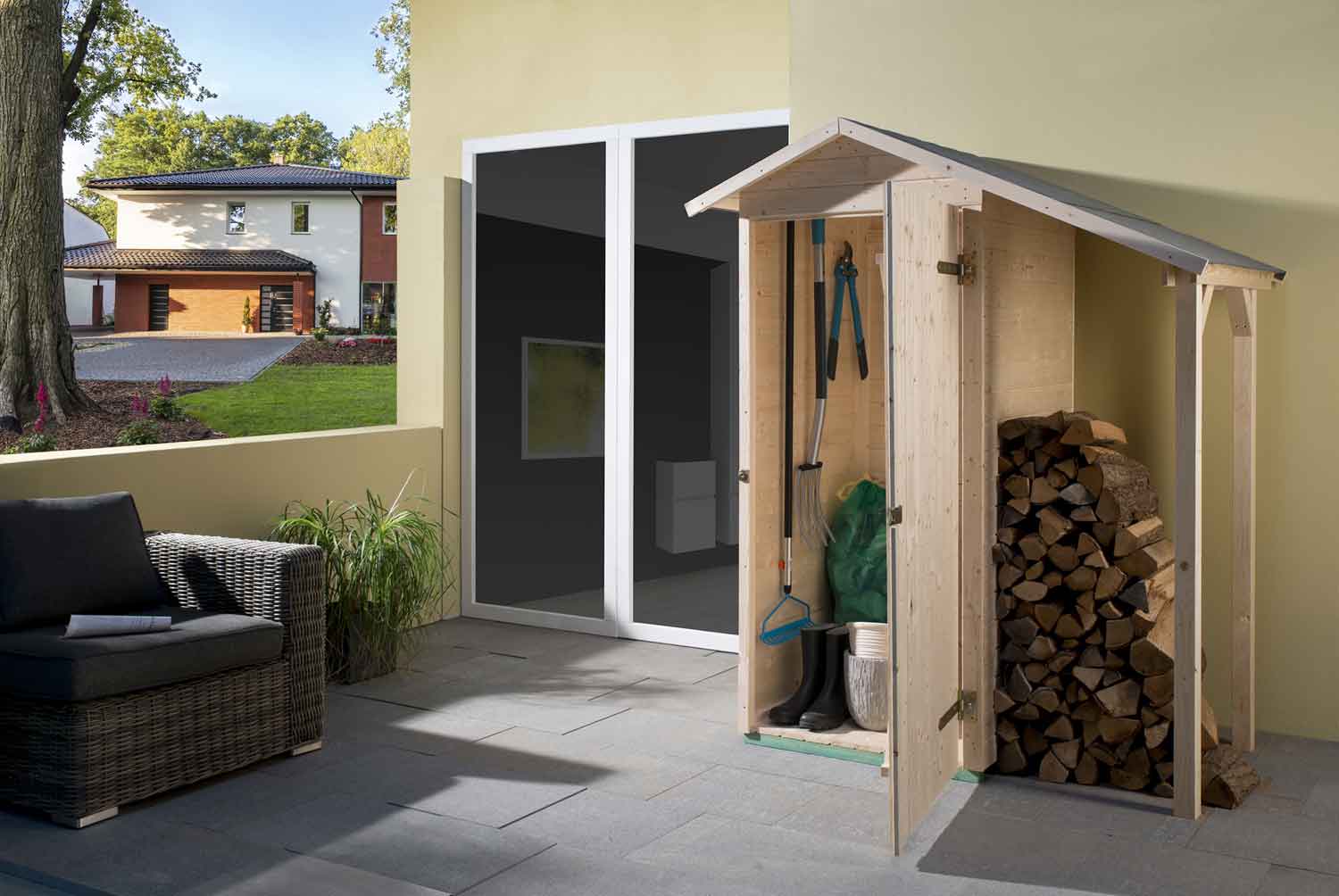 Ob Gießkanne, Sitzkissen oder Blumenerde, im Terrassenschrank hat alles seinen Platz. Unter dem kleinen Schleppdach ist Platz für Ihr Kaminholz.