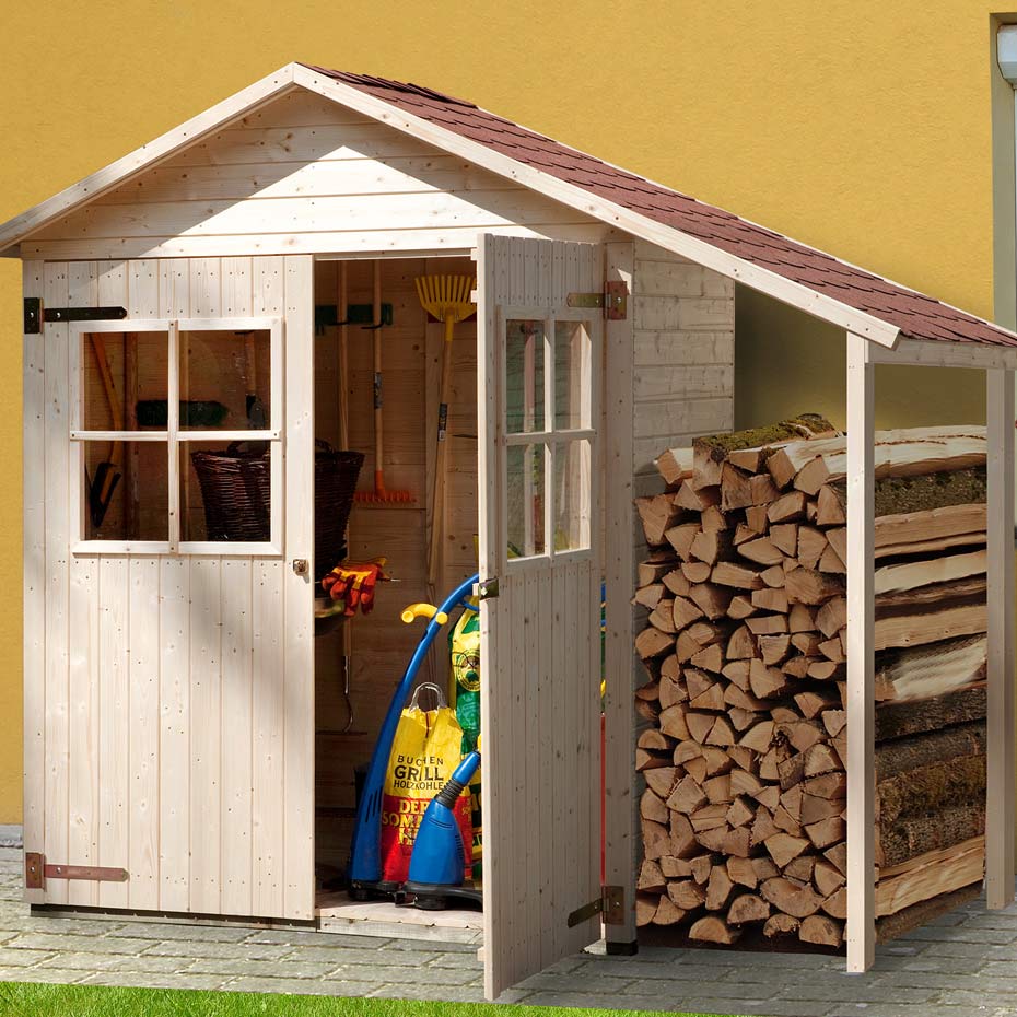 Ob Gießkanne, Sitzkissen oder Blumenerde, im Terrassenschrank hat alles seinen Platz. Unter dem kleinen Schleppdach ist Platz für Ihr Kaminholz.