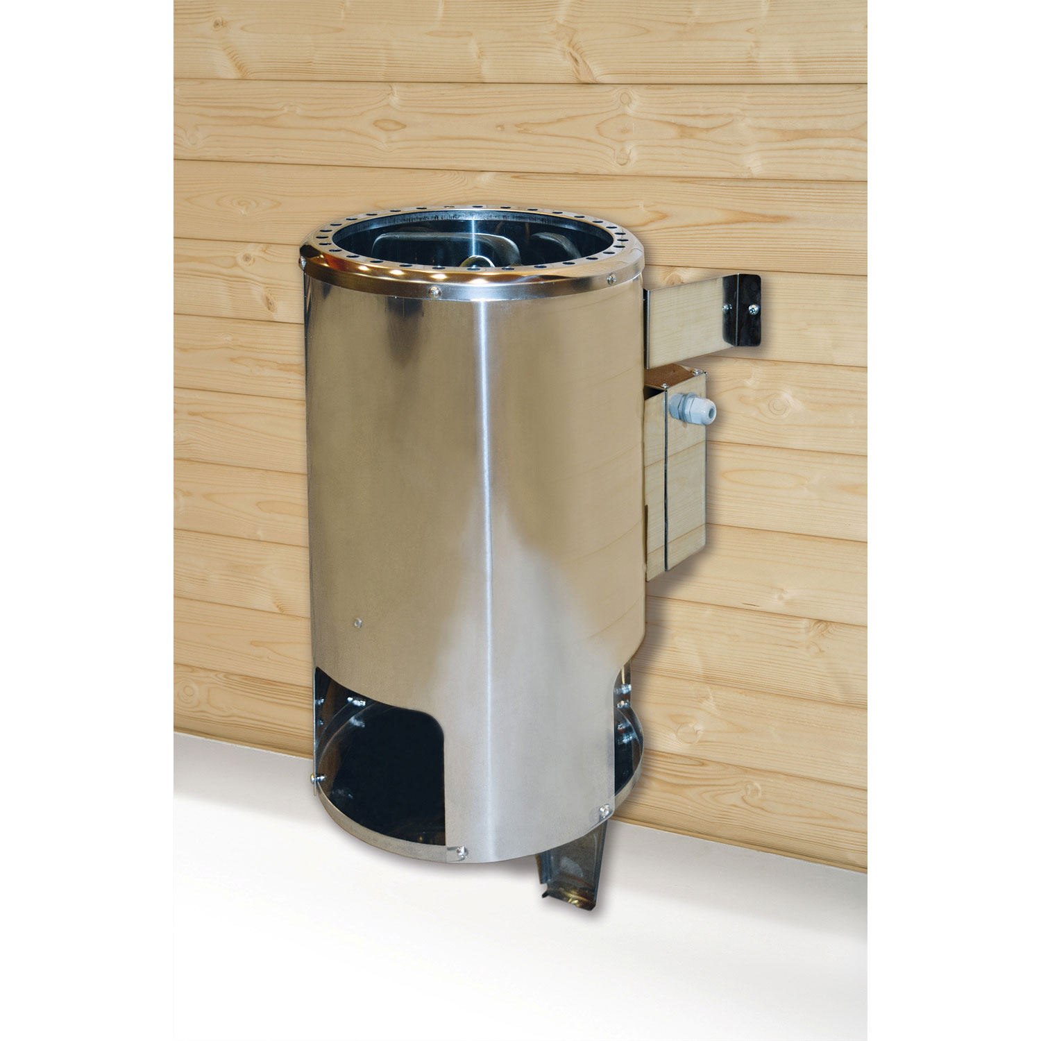 Wandausführung mit Standfuß doppelwandiger Außenmantel und verzinkter, rostgeschützter Steinkorb 4 Leistungsstufen für finnisches Saunieren bis 110°C geeignet für Kabinengrößen von 1 bis 5...