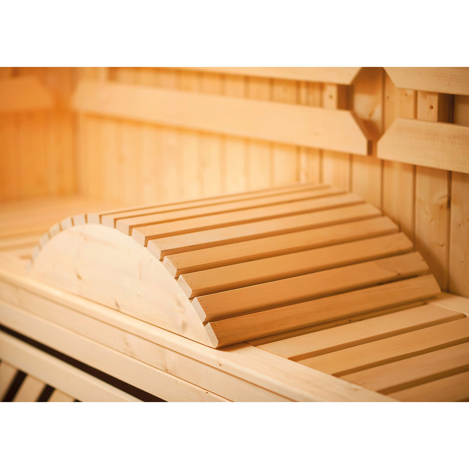Für noch mehr Komfort beim Saunieren sorgt die ergonomische Venenstütze aus hochwertigem Holz.