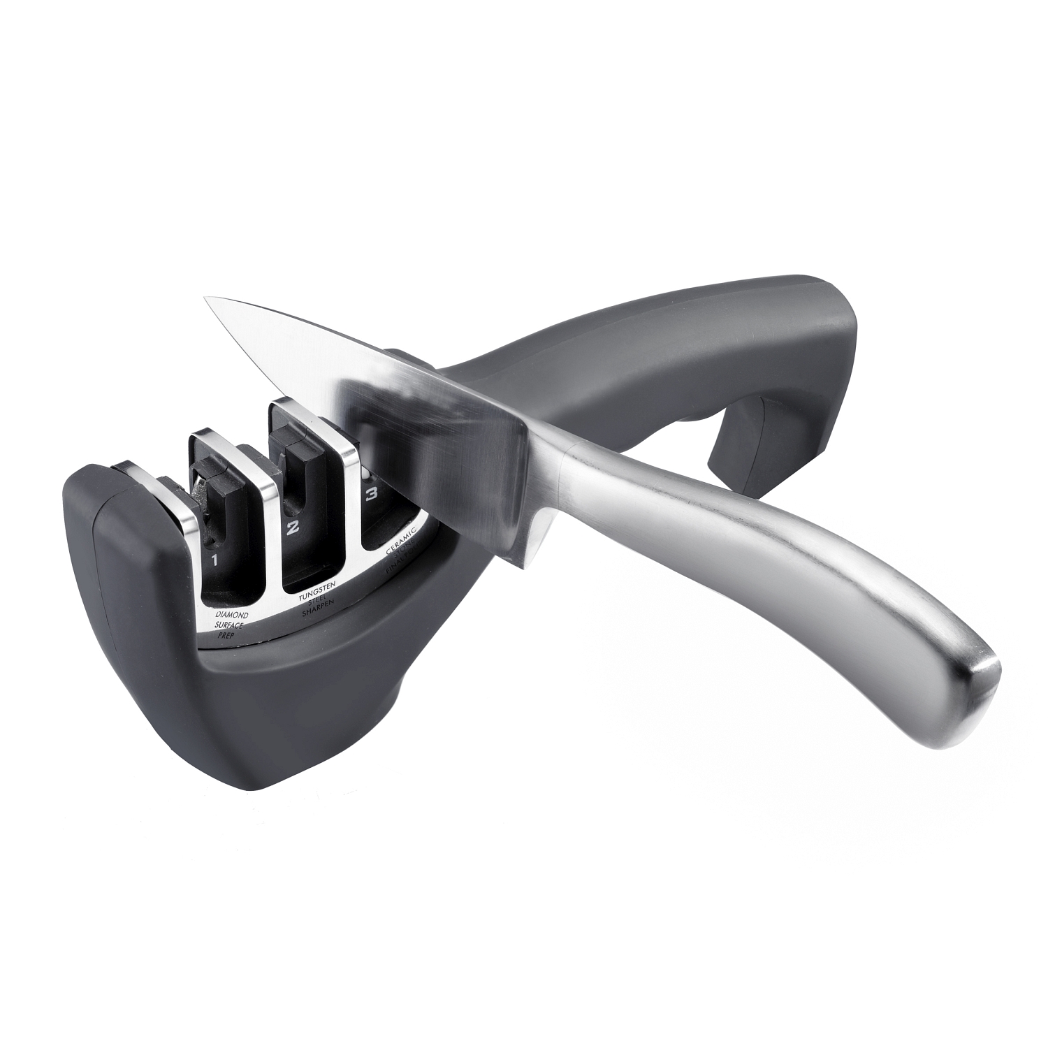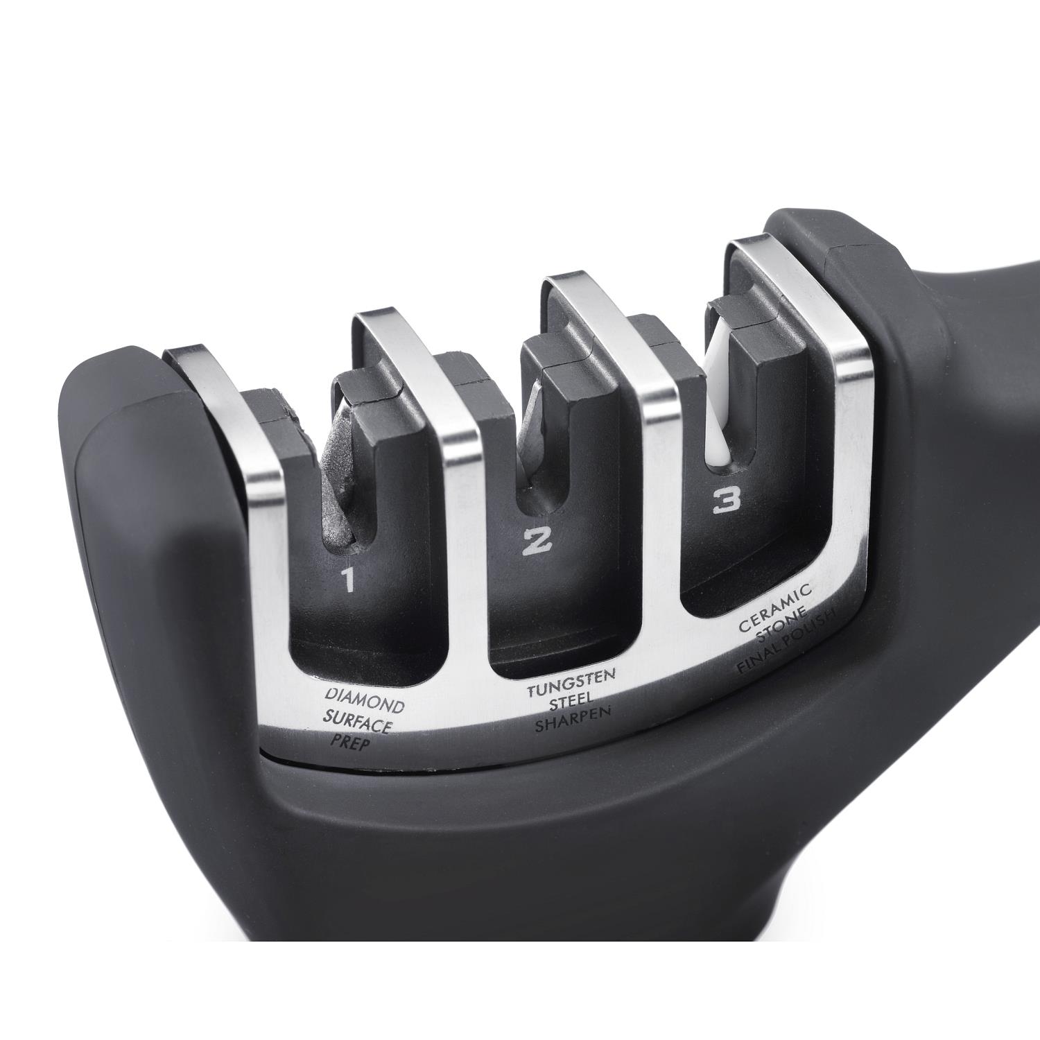 Messerschärfer "Deluxe" in 3 Stufen zu wieder scharfen Klingen mit ergonomischem Griff und Antirutsch-Gummierung für sicheren HaltABS, PP TPE
